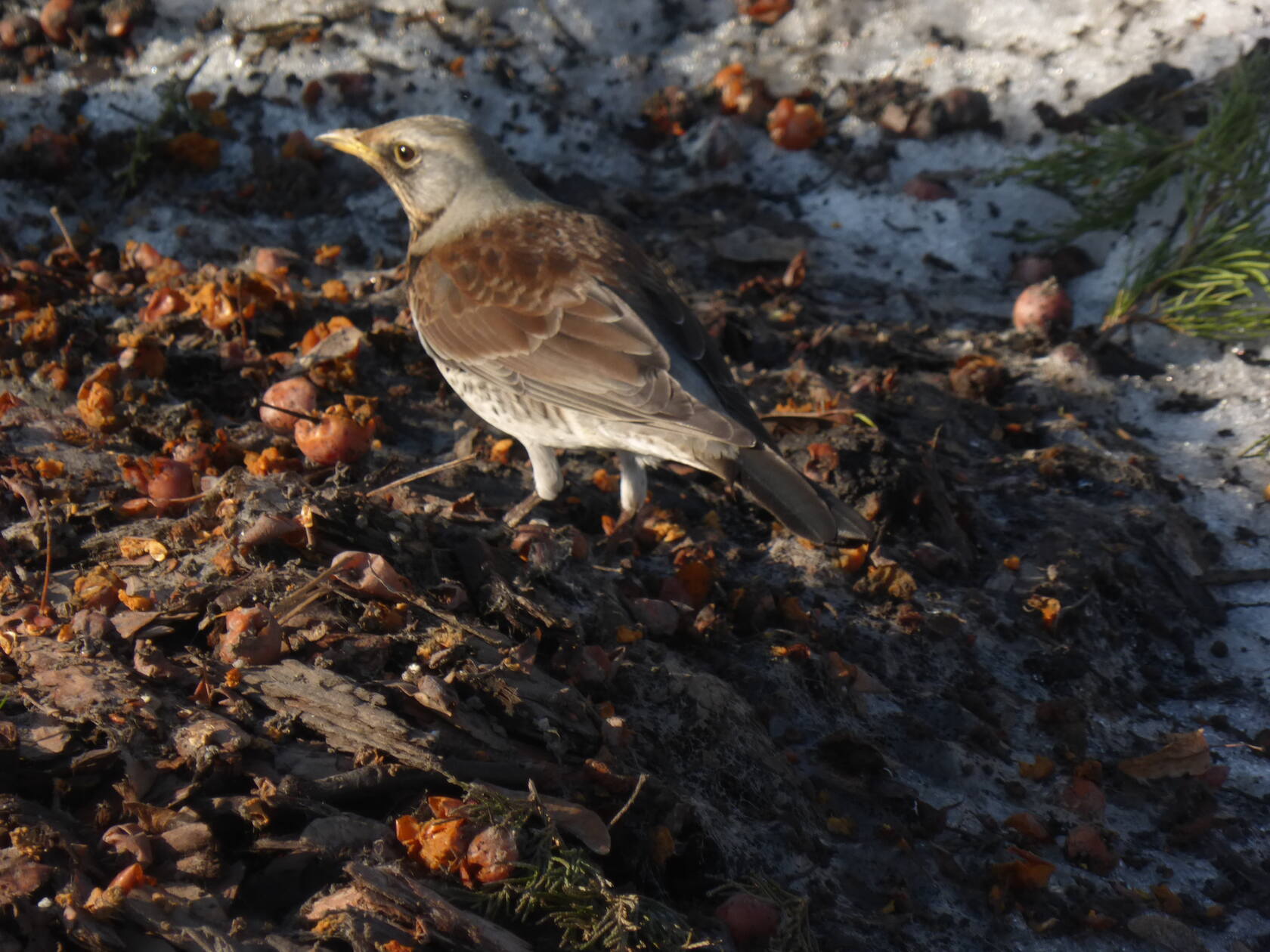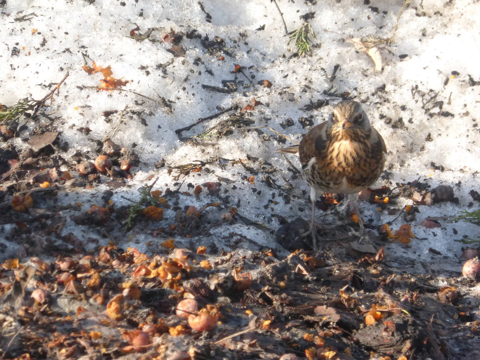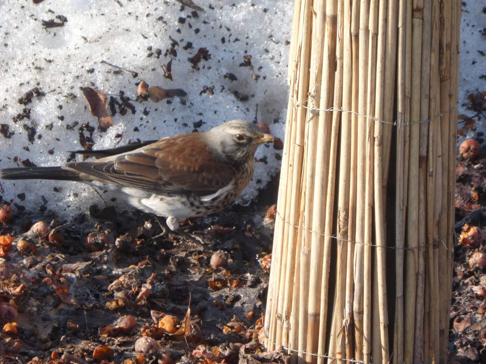 В последние годы в Москве, в разных местах понасажали много стройных саженцев с укрытыми тростником стволами. Зачем укрывают стволы - не знаю. На селе это была бы защита от зайцев, а в городе? Возможно на сайте питомника есть ответ, но я не искал. По крайней мере часть из этих деревьев -  декоративные яблони с мелкими красными яблочками сохраняющимися на дереве всю зиму. Не знаю, клюет ли кто-то висящие яблочки или они сами дружно падают ближе к весне. Видел только, что на упавшие слетаются дрозды-рябинники,  даже когда еще полно снега. Сегодня вблизи площади Гагарина заметил одного и пока его снимал прилетел второй.