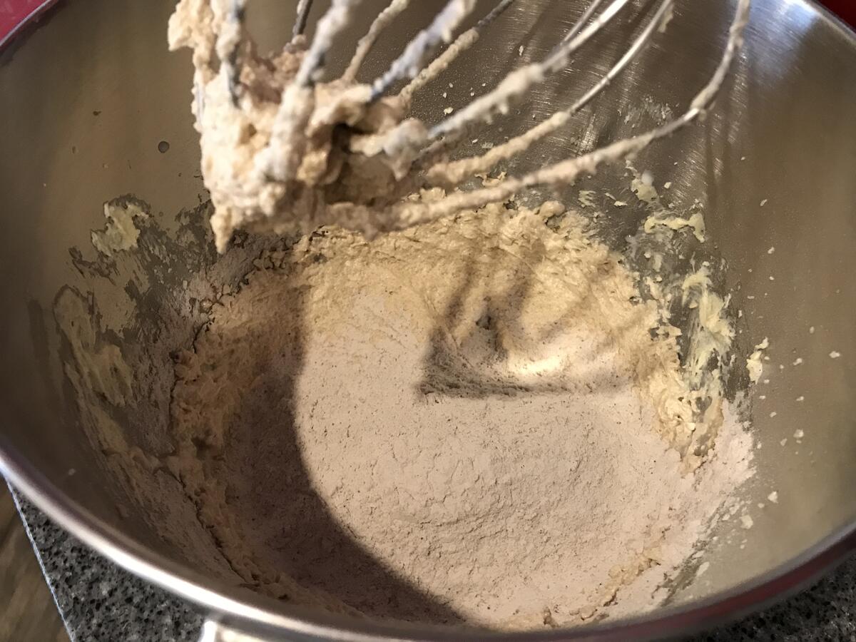 Теперь остальное молоко (125 гр.), вмешиваем на небольшой скорости. И оставшуюся сушку: