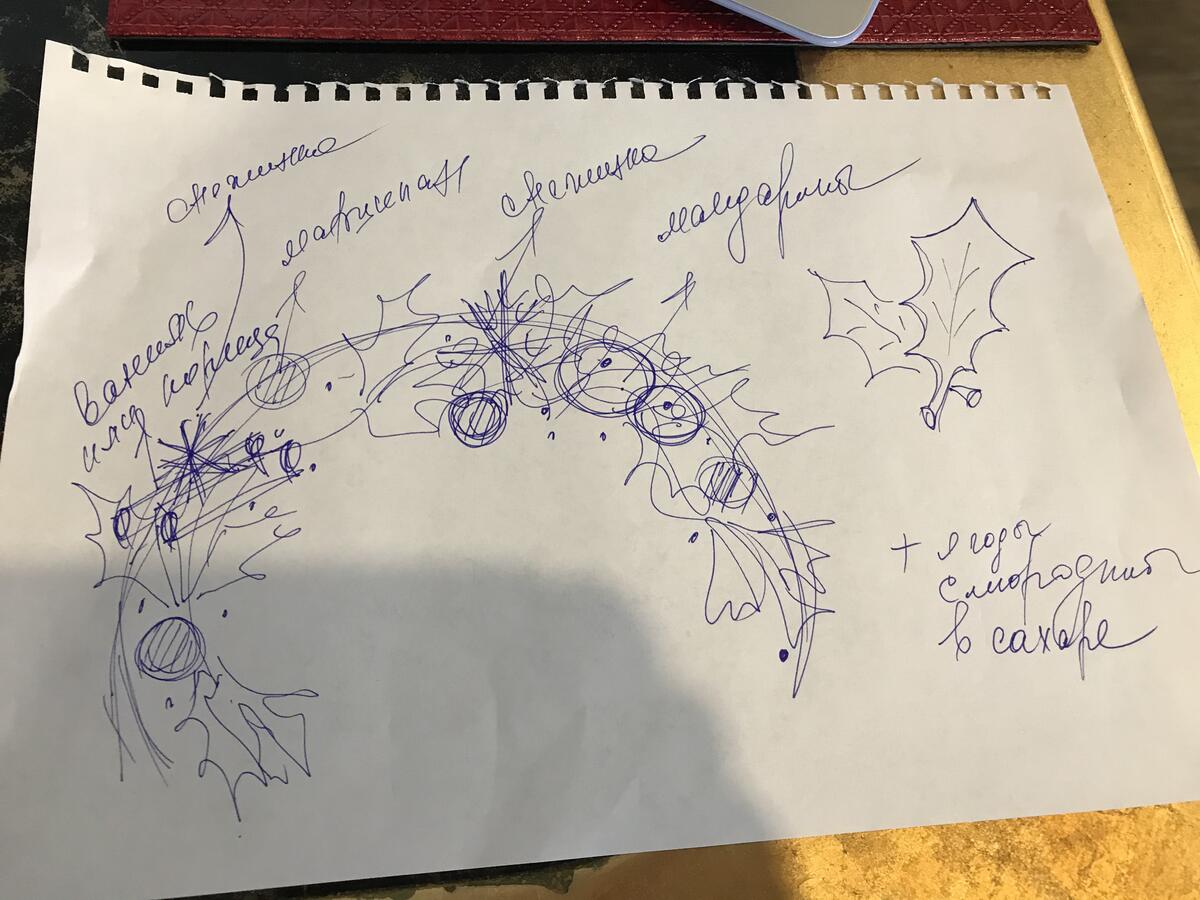 Занялась украшениями. Покрасила белый шоколад в зеленый цвет и сделала несколько листиков типа омелы. Когда делала безешки на тарт, заодно сделала снежинки из безе. Потом смородину обмакнула в сахарный сироп и обваляла в сахаре (типа снег это у меня будет). Сделала марципан, обваляла в сахарной пудре (снежки вроде как). Надрала немножко розмарина (вроде как ёлка). Нашла палочку корицы (чего только нет у меня в запасах). Почистила два мини-мандарина (на фото есть лишние элементы, приготовила всего побольше, но не всё пригодилось)... ну, вроде всё, принимаемся за крем.