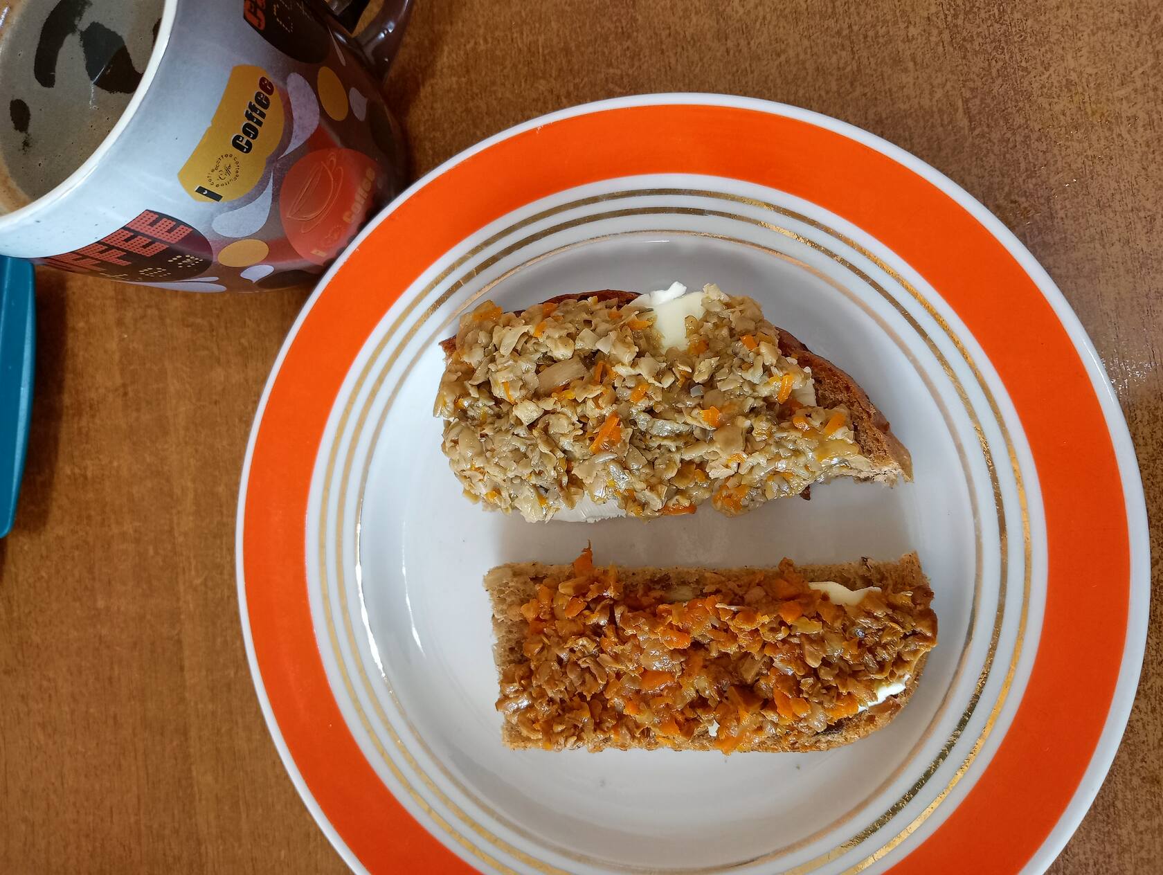Снизу - бутерброд с лисичковой икрой, сверху - с сыроежковой. Несмотря на то, что рецептура одна и та же, икра очень различается по вкусу и консистенции (вкус - сыроежки придают некий аромат "засолочных" грибов, консистенция - т.к. шкурку с сыроежек не счищала, в готовом продукте есть какая-то небольшая желеобразность)