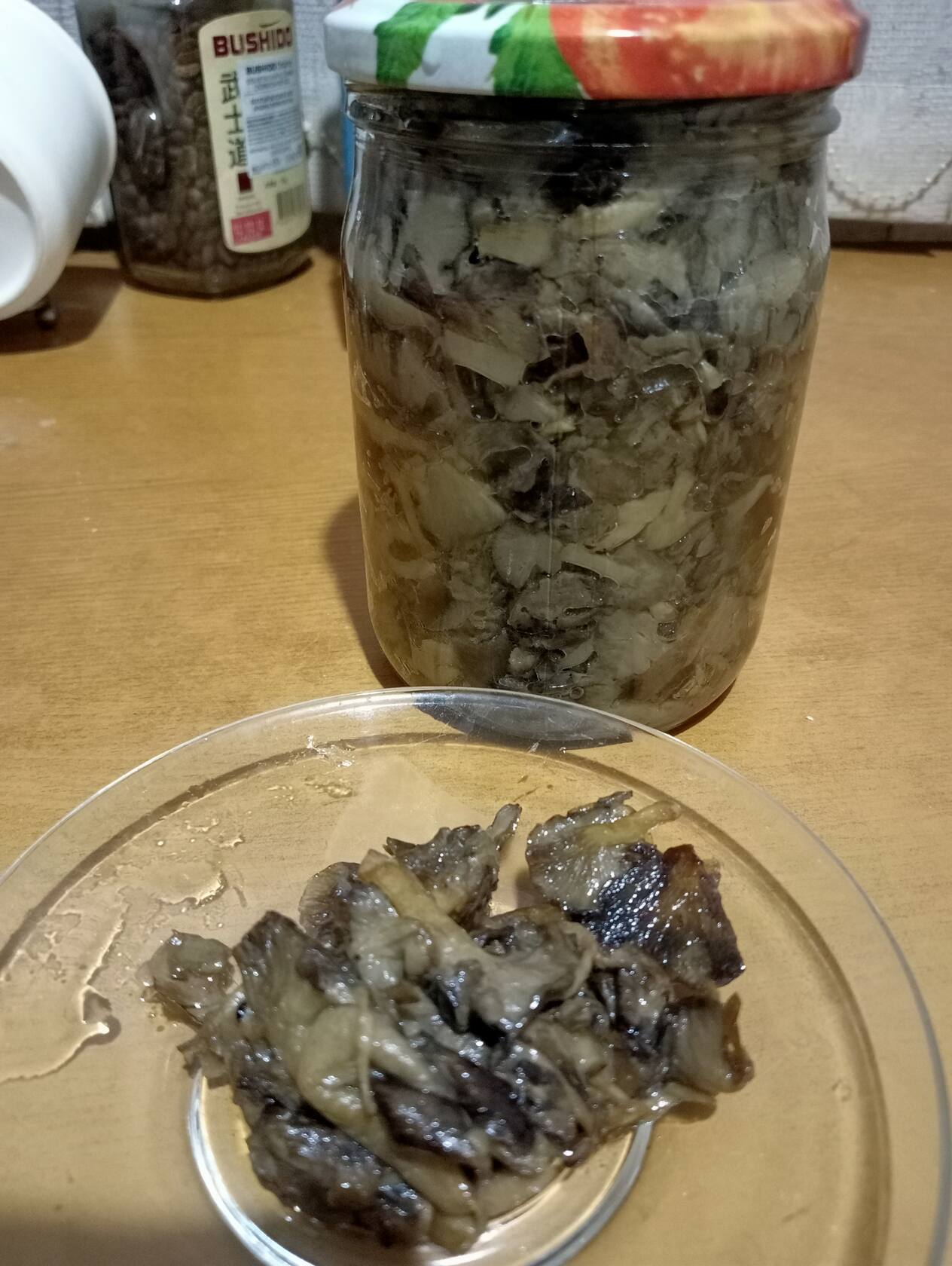 Не очень красиво выглядит, но решила опубликовать - вдруг кому пригодится. Время-то гигрофорное пока. Из корзинки гигрофоров в ужаренном виде вышло где-то примерно литр с небольшим по объему. БОльшую часть честно отнесла дочке (за то что мужественно собирала и не просилась устраивать чаепитие:D). А поллитру закатала. Помню, что весной это очень вкусно и очень концентрированно. Ту часть, что не утрамбовалась в банку (то что на блюдечке выглядит, будто кто-то из моих собак не дотерпел до вечерней прогулки:D) буду есть уже завтра. Но пару грибов слямзила. Очень вкусно. Запах очень знакомый. Что -то из "советских" грибов: маслята? серушки? Не могу вспомнить... Может, кто подскажет?