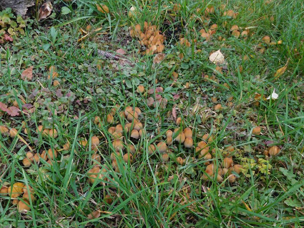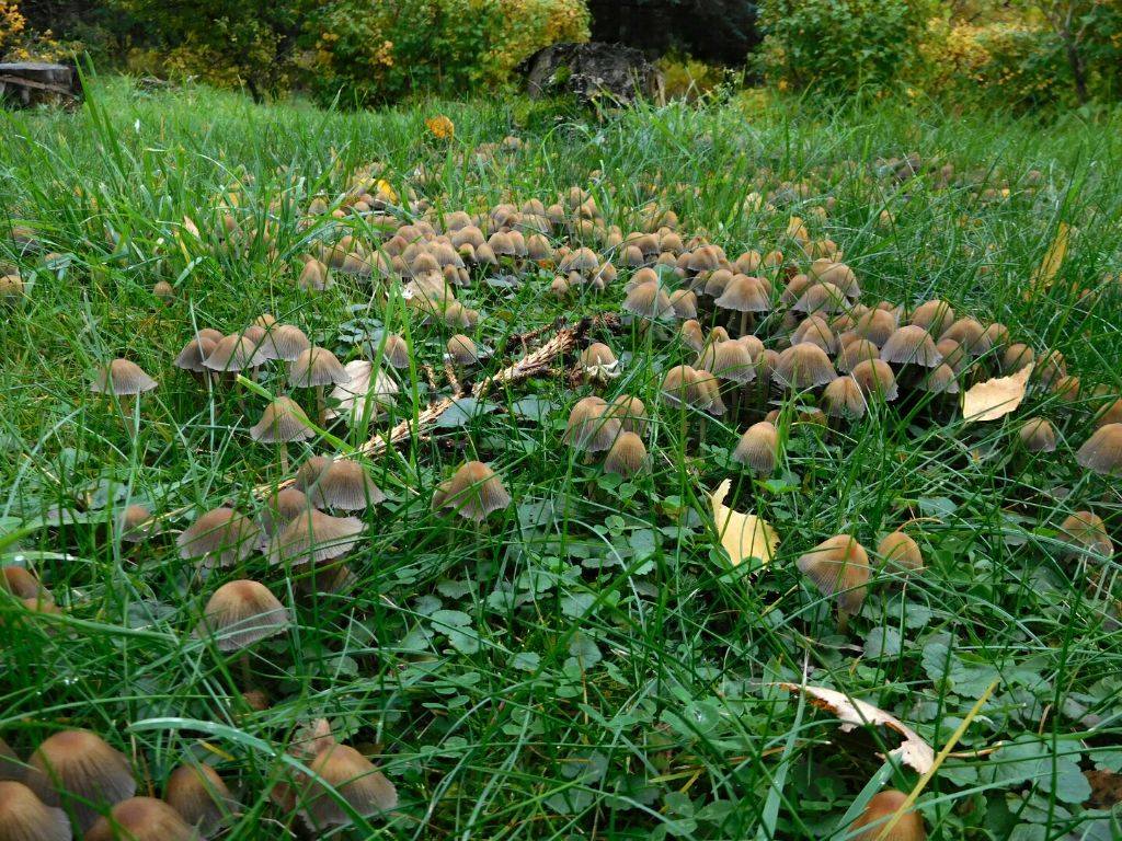 Тьма тьмущая мерцающих навозничков (Coprinellus micaceus) и россыпь желтоватых мицен (Atheniella flavoalba)