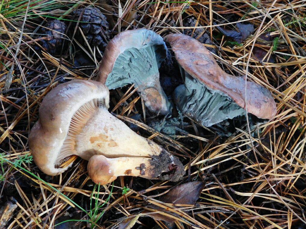Двухэтажная сыроежка и пурпурная мокруха, поражённая какой-то синей плесенью. Наверное, не гипомицесом, а грибом Penicillium brevicompactum.