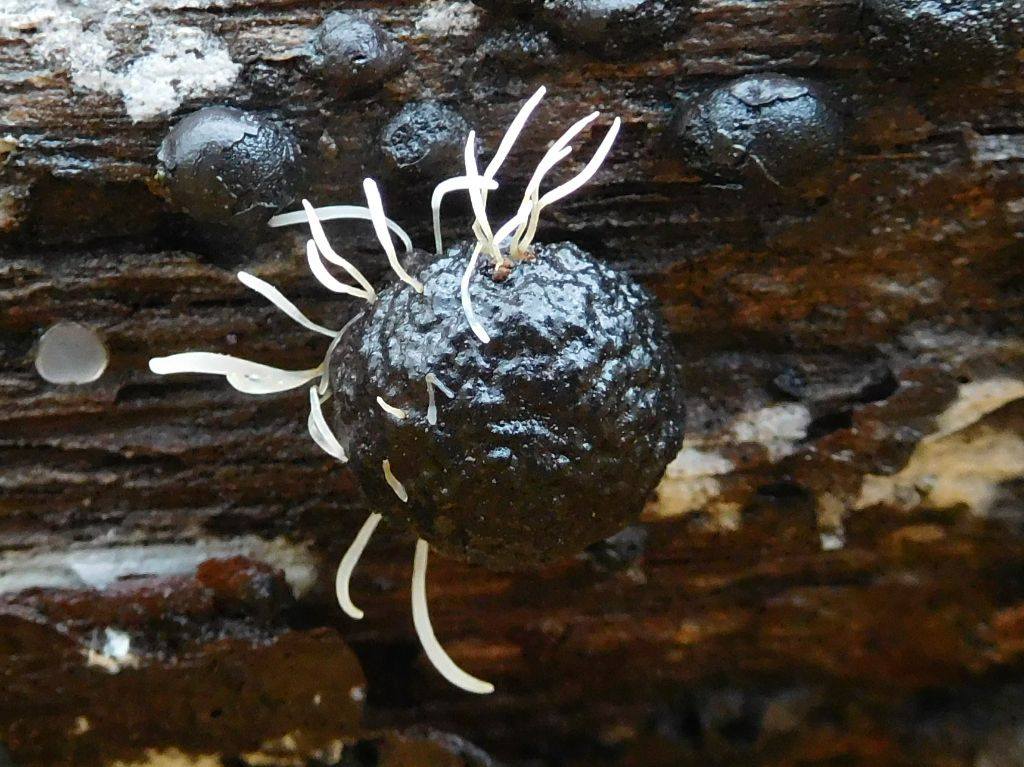 Neobulgaria pura, Daldinia sp. и какая-то Typhula sp. на старой дальдинии. Всё на одном валежном стволе