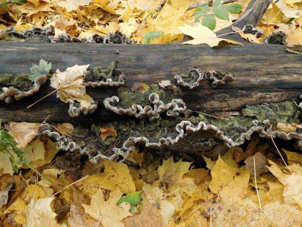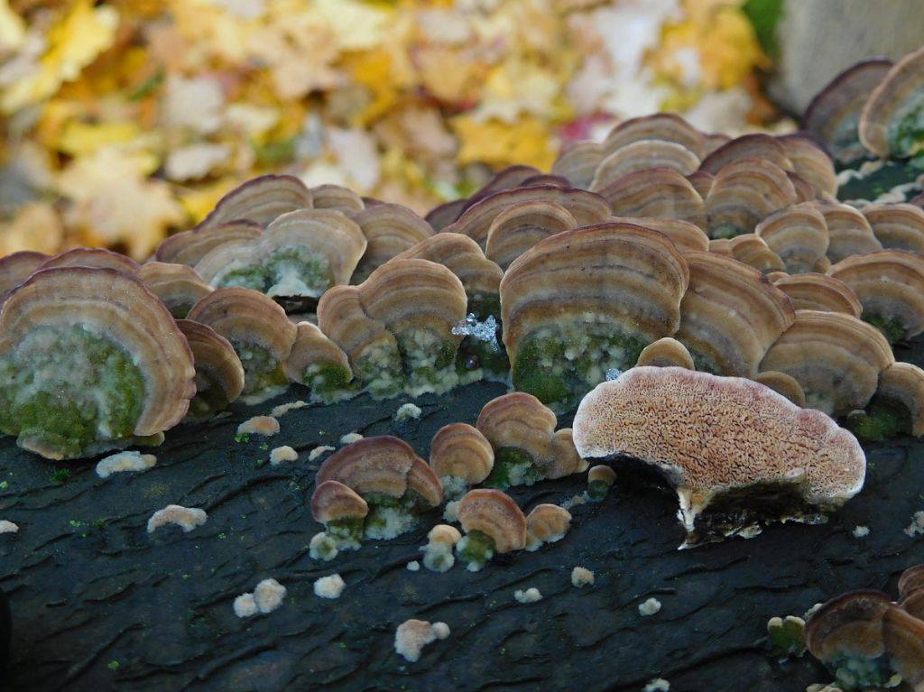 Ещё один ствол-общежитие. Поздняя вешенка ("сиротинушка"), трихаптум двоякий (впопыхах принял его за церрену, спасибо Наталье за бдительность) и крошечные, но симпатичные поганочки