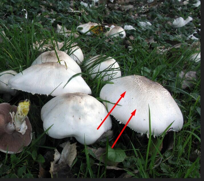 Что касается Шампиньона желтокожего, то цвет шляпки у немцев описан верно: 3-14 (18) cm Ø, weiß, alt graubraun bis gelbbraun, Mitte auch mit bräunlich +/- schuppigen Zonen, beim Reiben gelblich verfärbend, jung halbkugelig, konvex, im Alter abgeflacht.