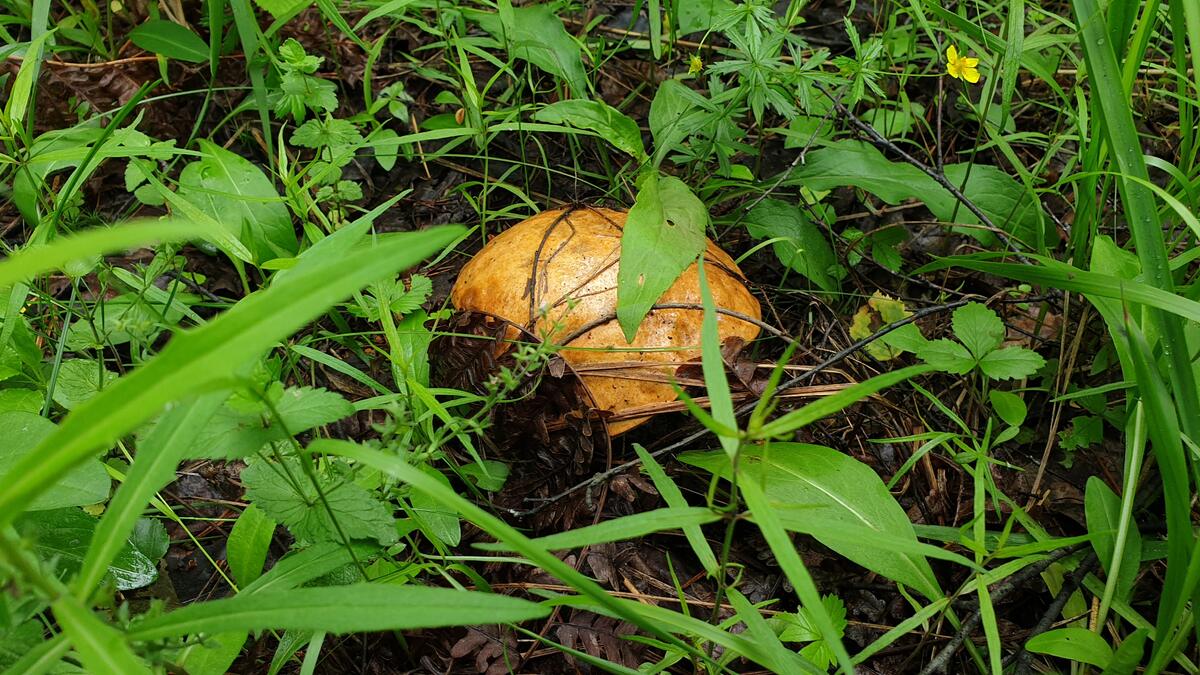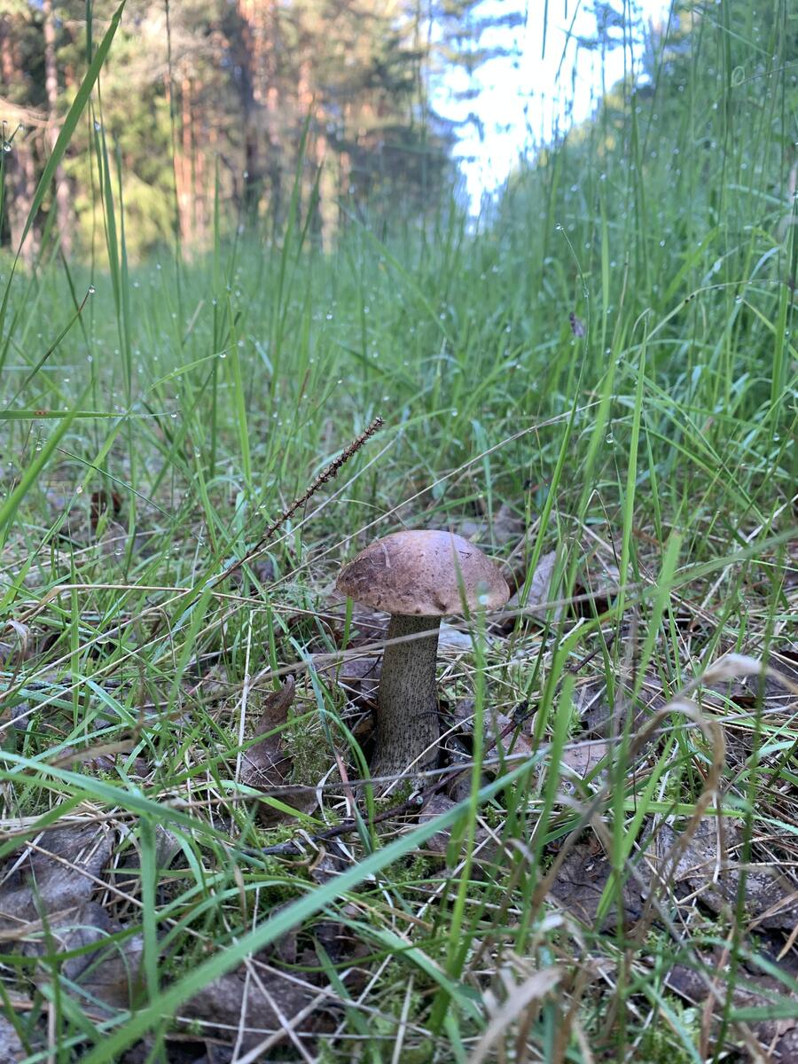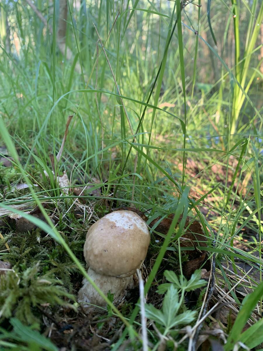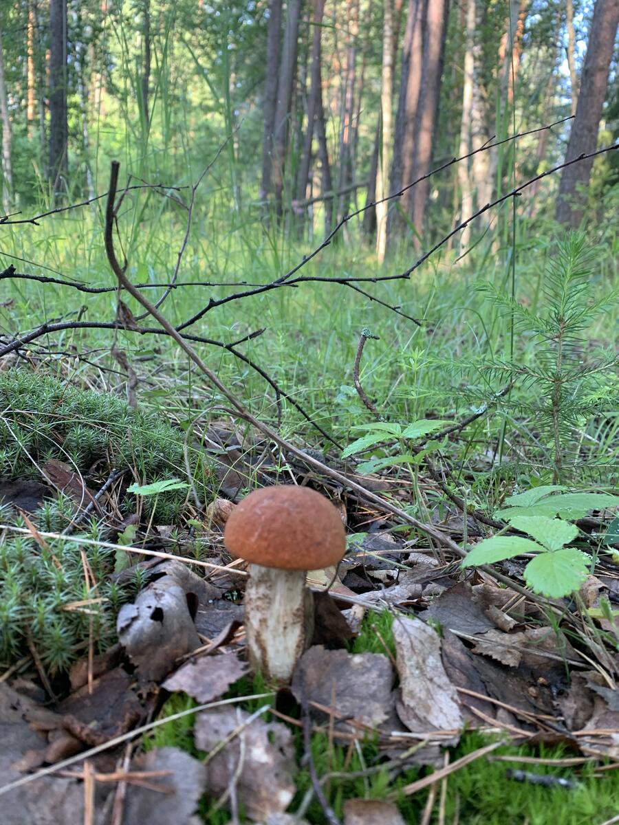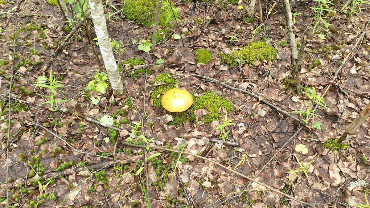 Всем здравствуйте! Первый мой отчёт в этом году так как писать особо не о чем было. Пробежался сегодня утром по своим околодачным воскресенским лесам где обычно начинались первые болетовые. В этом году трава по пояс и что либо в ней заметить проблематично даже если это что либо там есть. В старых ёлках где обычно первыми стартуют лисички пока пусто. В орешнике где всегда грибы видны за километр тоже повылезала трава и тоже ничего. Но свои первые грибочки я нашел прямо на тропинке с краю в березах благодаря раздавленному невнимательным грибников белому. Так же попалась одна свинушка и пенек с молодыми летними опятами которые оставил подрастать. Ну в общем и целом в лесу пока у нас делать нечего, хотя при желании на тарелку супа наковырять можно. Ну и для сравнения выложу фотки с работы, где можно набрать грибов не на одну сковородку, но их никто не собирает. Чтобы понять  масштаб происходящего безобразия приложен тапок 44 размера. Всем удачи и полных корзин!