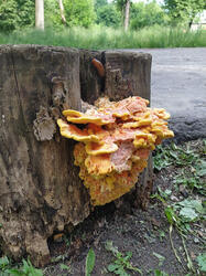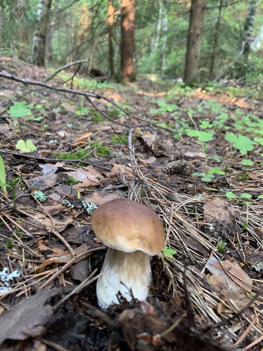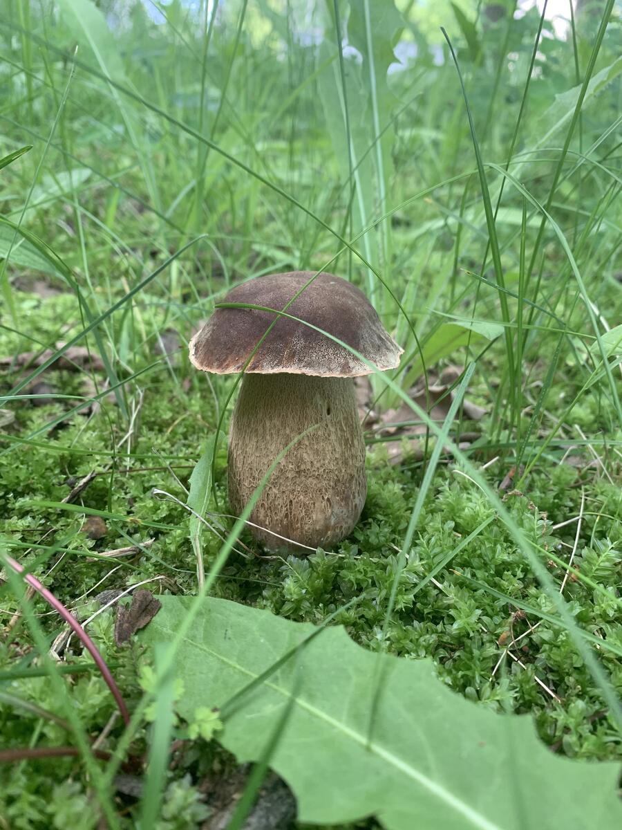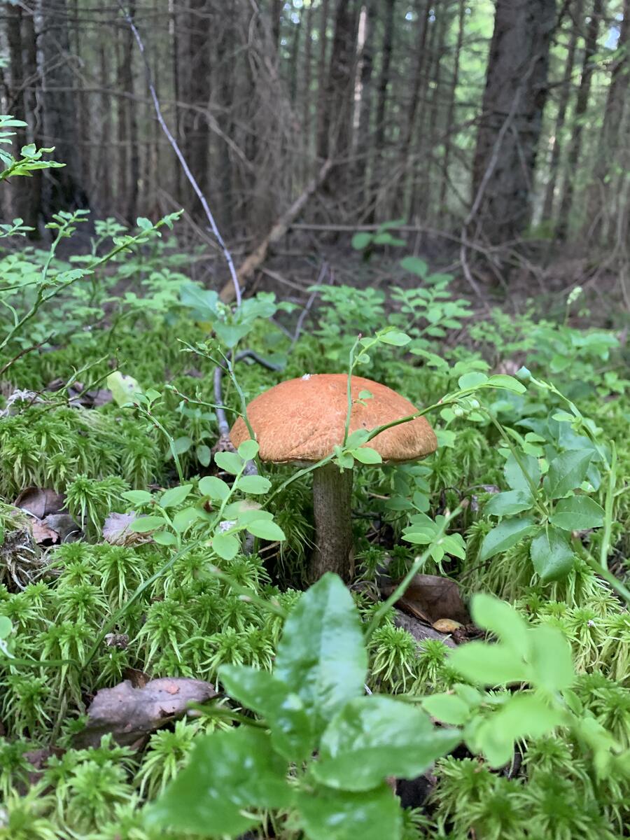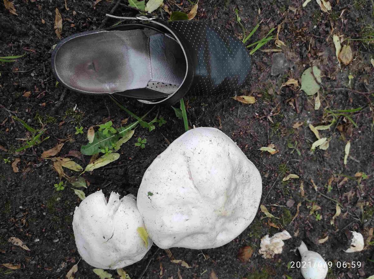Всем здравствуйте! Первый мой отчёт в этом году так как писать особо не о чем было. Пробежался сегодня утром по своим околодачным воскресенским лесам где обычно начинались первые болетовые. В этом году трава по пояс и что либо в ней заметить проблематично даже если это что либо там есть. В старых ёлках где обычно первыми стартуют лисички пока пусто. В орешнике где всегда грибы видны за километр тоже повылезала трава и тоже ничего. Но свои первые грибочки я нашел прямо на тропинке с краю в березах благодаря раздавленному невнимательным грибников белому. Так же попалась одна свинушка и пенек с молодыми летними опятами которые оставил подрастать. Ну в общем и целом в лесу пока у нас делать нечего, хотя при желании на тарелку супа наковырять можно. Ну и для сравнения выложу фотки с работы, где можно набрать грибов не на одну сковородку, но их никто не собирает. Чтобы понять  масштаб происходящего безобразия приложен тапок 44 размера. Всем удачи и полных корзин!