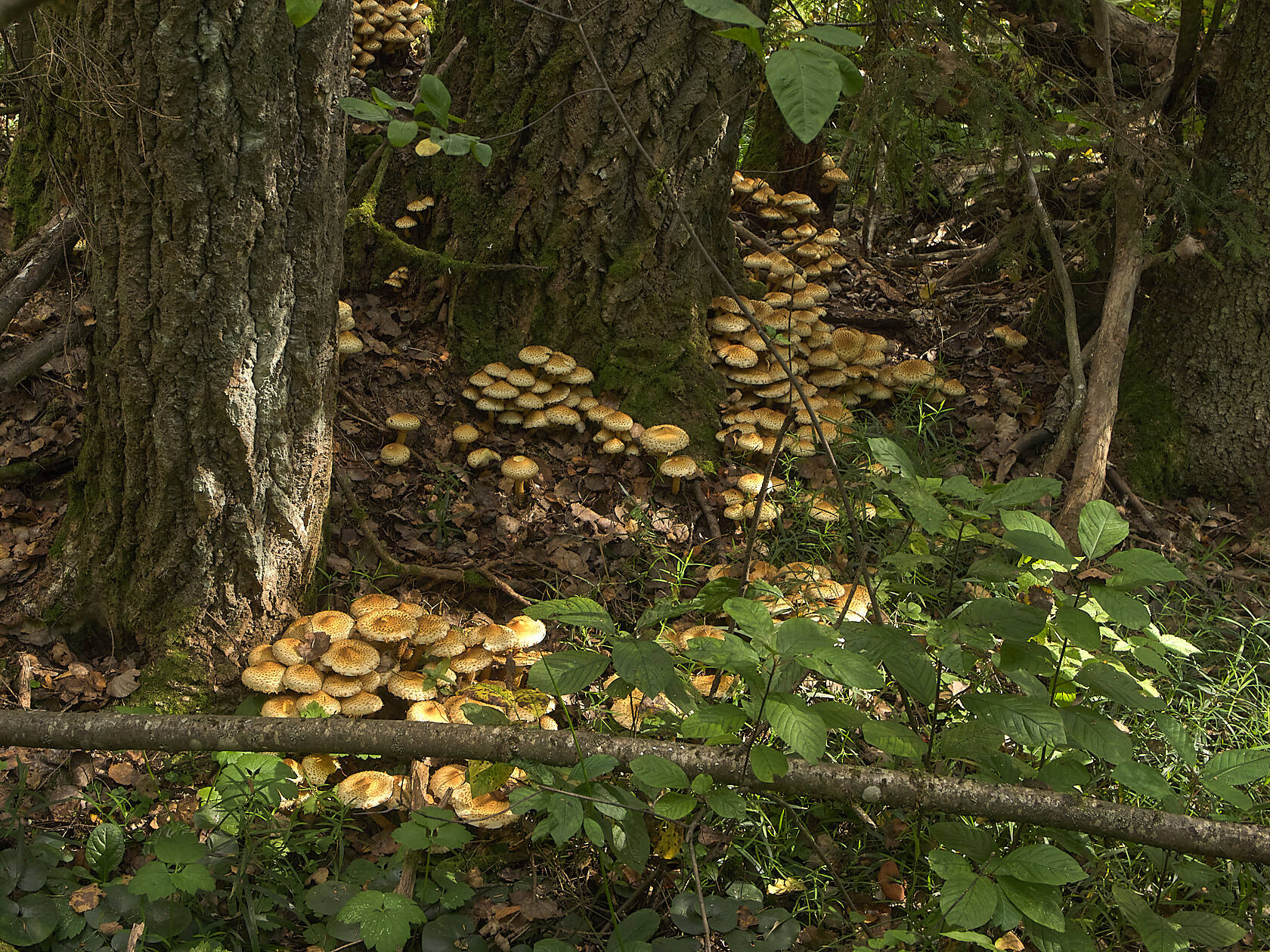 Работали отдельные и очень выборочно грибницы белых, грабовиков, почти никак не проявили себя прочие виды подберезовиков, слабенько сработали подосиновики. Тоже самое и с опятами. Да, выход осенних опят (минимум двух-трех видов одновременно) был дружным, но по содержанию слабеньким. Там, где раньше торчало три десятка пучка, вырастало один-два. Многие бревна и пни вообще не дали урожая. Поэтому набрать грибов можно было, но зная лес и при удачном времени выхода в него.