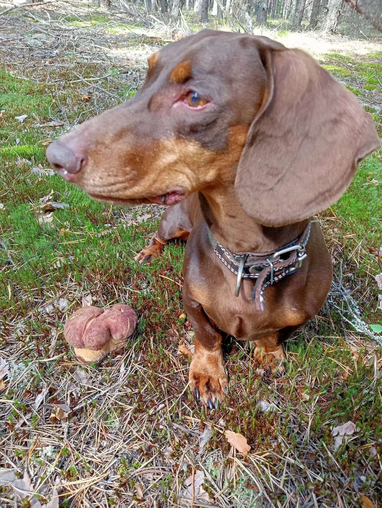 Фото в кофейных тонах (шоколадный такс, коричневый боровичок, ржаво-красная подстилка мха)