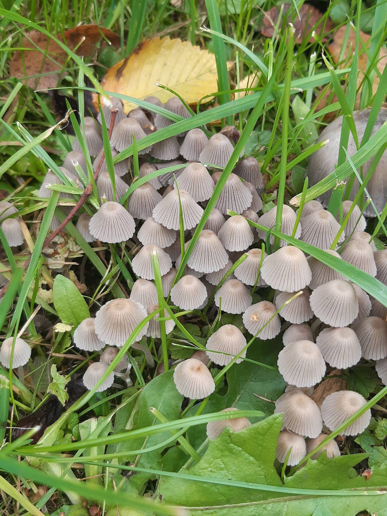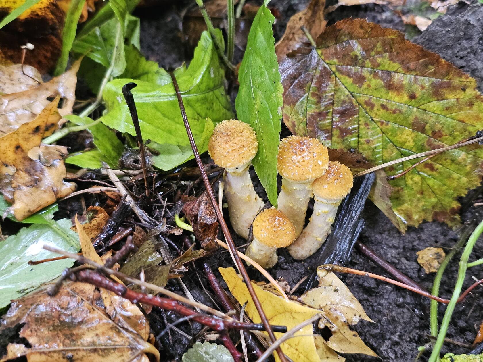Поразила крошечная синичка рядом - наверное, рядовка сорная. Несколько вполне сформированных плодовых тел с размахом шляпки менее сантиметра. При том что рядом - вполне нормальные синеножки. Сезон, кажется, просто не знает, что ещё отчебучить...