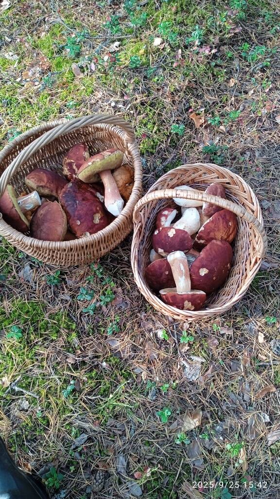 Всем привет. Сегодня ходил в самую дальнюю точку у себя. Был и в болотине, посадках, ельнике, большом осиннике, черничнике. Цель как и писал ранее рядовка фиолетовая. В итоге штук 15 нашел. Дымка 10. Подосиновики разные красные, желто-бурые- все большие, но на жареху набрал. Чуток чешуйки, малость чернушек, 1 белый дед лесовик подарил шикарный, встречаются лисички и жёлтые сыроеги. От опят в глазах жуть, они стали коричневыми, и мешают, реально сплошной ковер на земле, больше чем листвы. Заметил, что последние мелкие не выросли в лопухи а благополучно завяли в середине роста. Странно по фиолетовой и дымке всегда вместе а тут в розь, и по размерам. В прошлом году я за ними ходил 26 октября в деревне ( последнее фото)- корзины 26.10.2024,а сейчас ощущение что уже и все. Проверим через месяц, отпуск заканчивается, пора и поработать Странный сезон, без подберов и подосиновиков, слой белых  в прошлом году конец июля , в этом середина августа. Всем добра и мирного неба над головой.