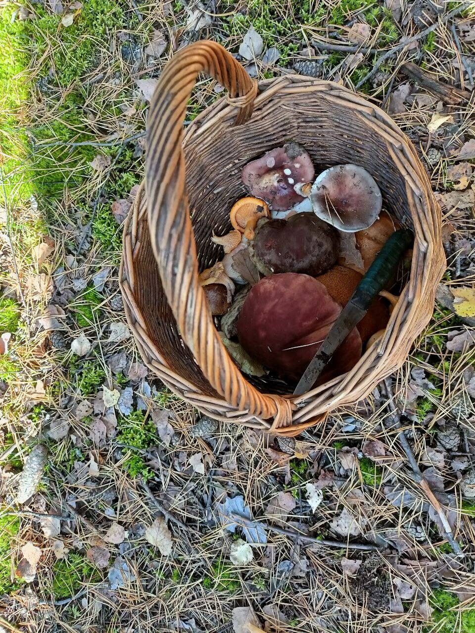 Неделю в лесу не были и за это время там сильно опустело. Единичные маслята были перемороженные. Сыроежки только старые. 2 семьи серух, но мы их не берем. Но все-таки наша тропа нас не подвела. 4 синяка, 4 подосиновика и 3 боровика. Последний боровик огромный и муж его увидел из машины когда уезжали и потому на фото корзины не попал. Грибы все чистые.
