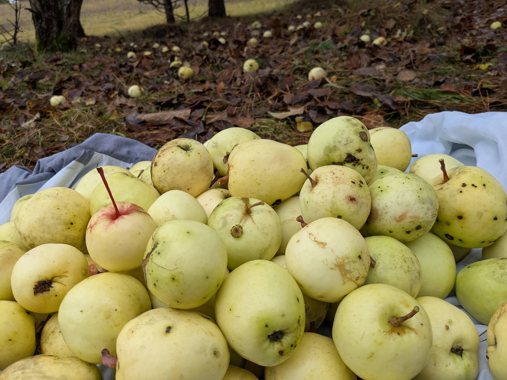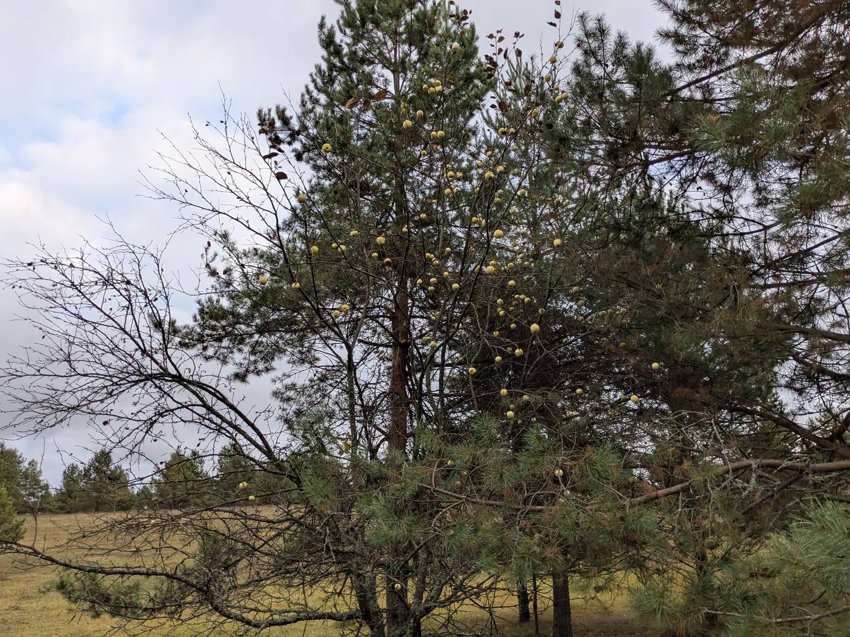 Были сегодня за Тюрмеровкой. Гигрофоры и фиолетовая рядовка, в основном крупная. Набрали, как в прошлый раз яблок, картина маслом, листьев нет, а яблоки до сих пор висят на фоне сосны. Напоследок  попался рыжик, один, как бы попрощался до следующего сезона.