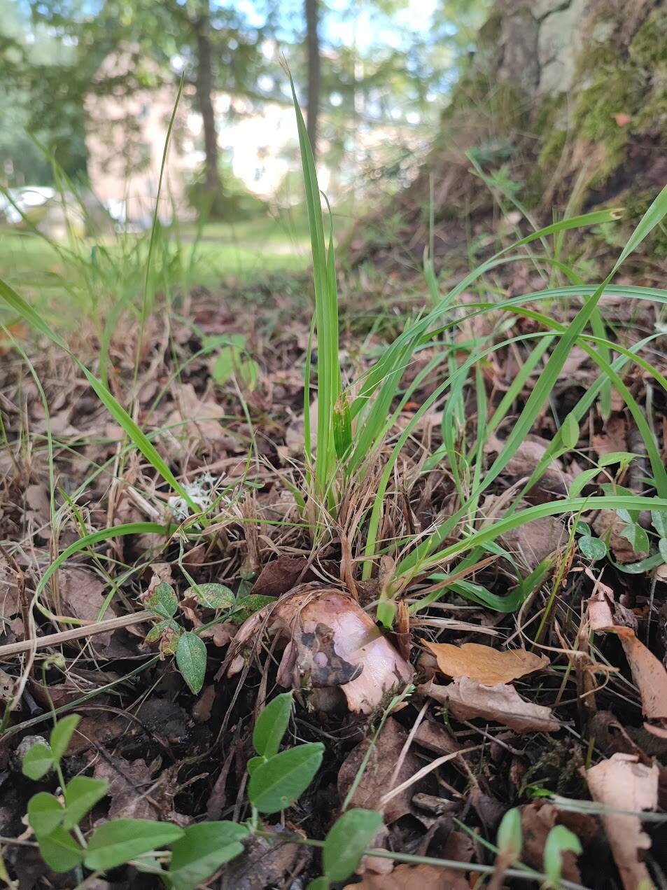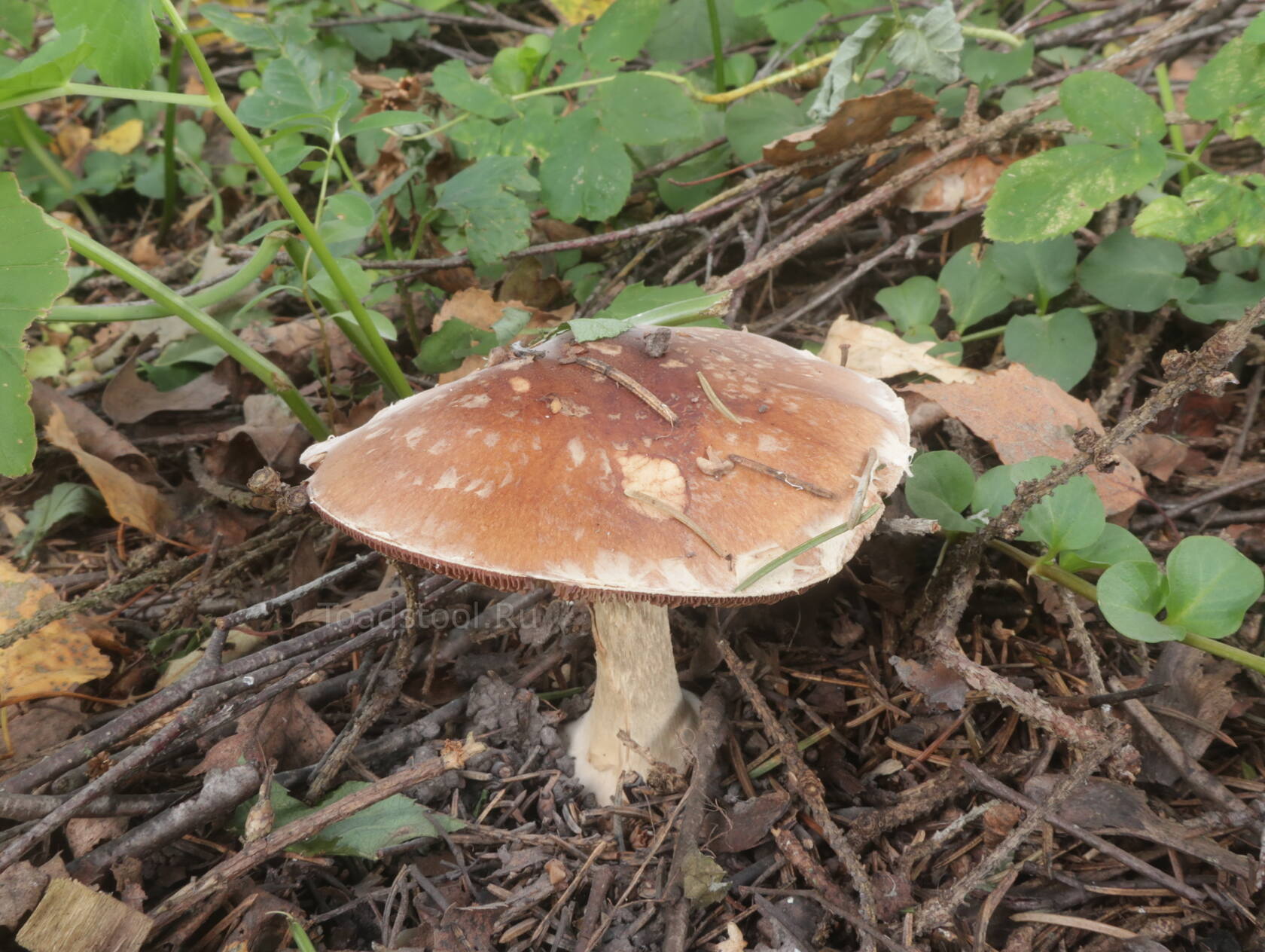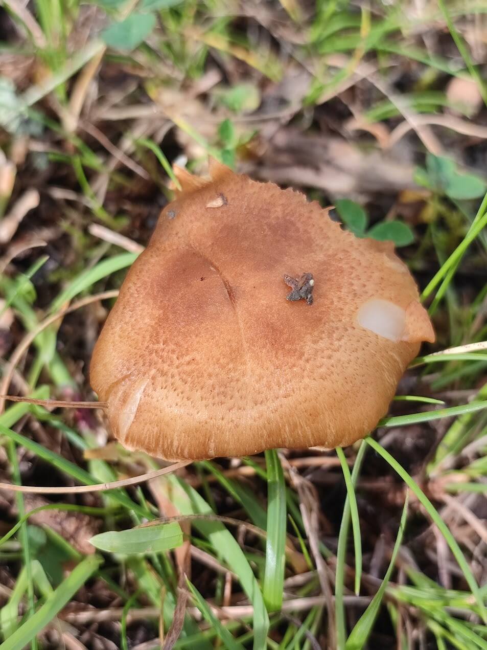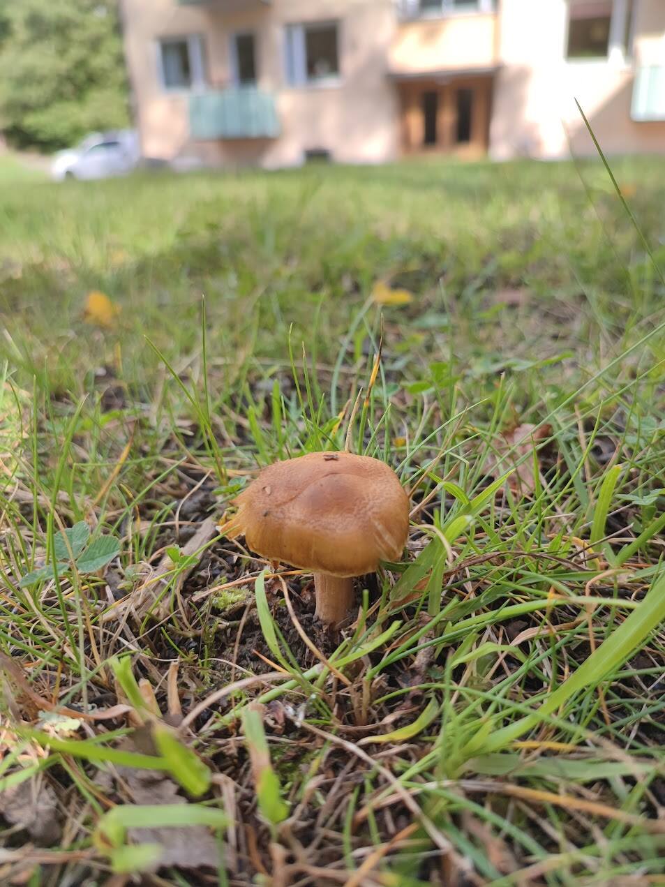 37.  Не очень маленький коричневый грибок, на газоне между дубом и берёзой. Не могу даже до семейства предположить, что это: