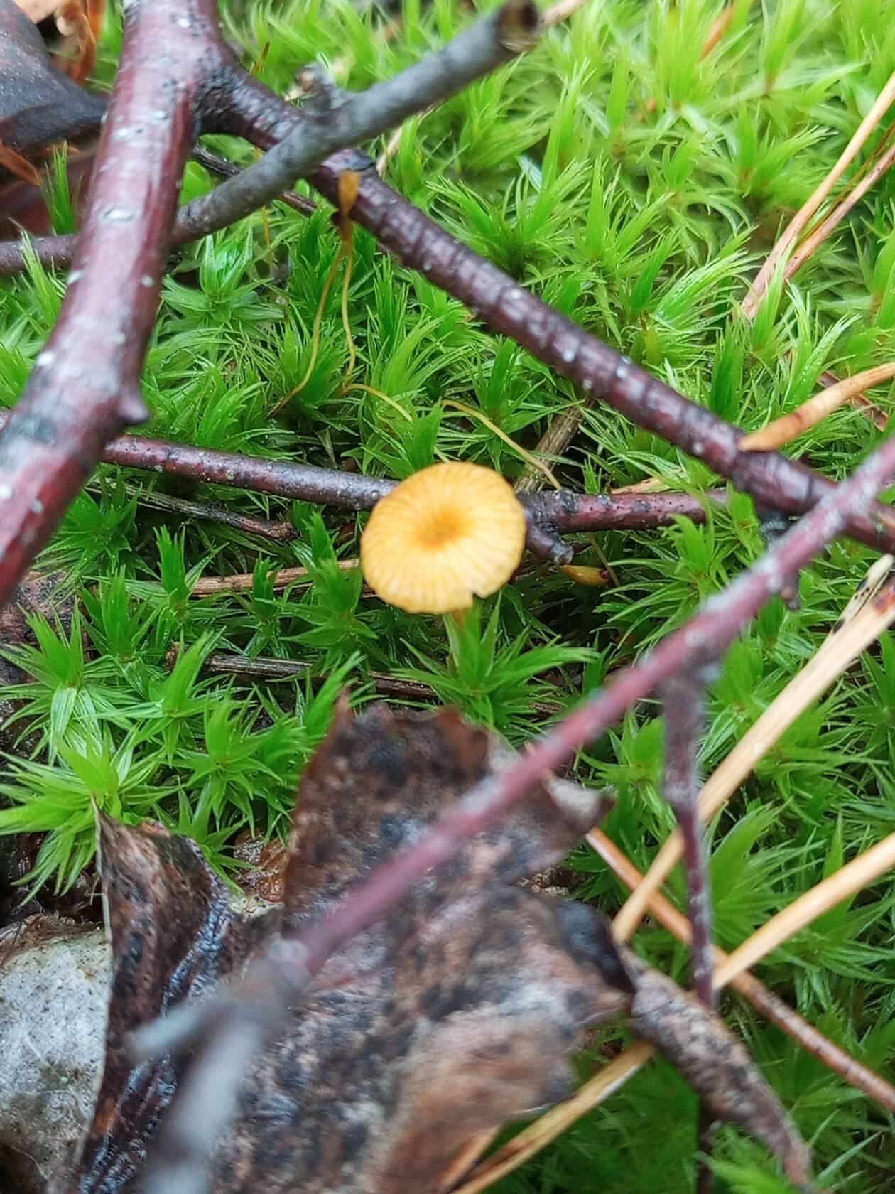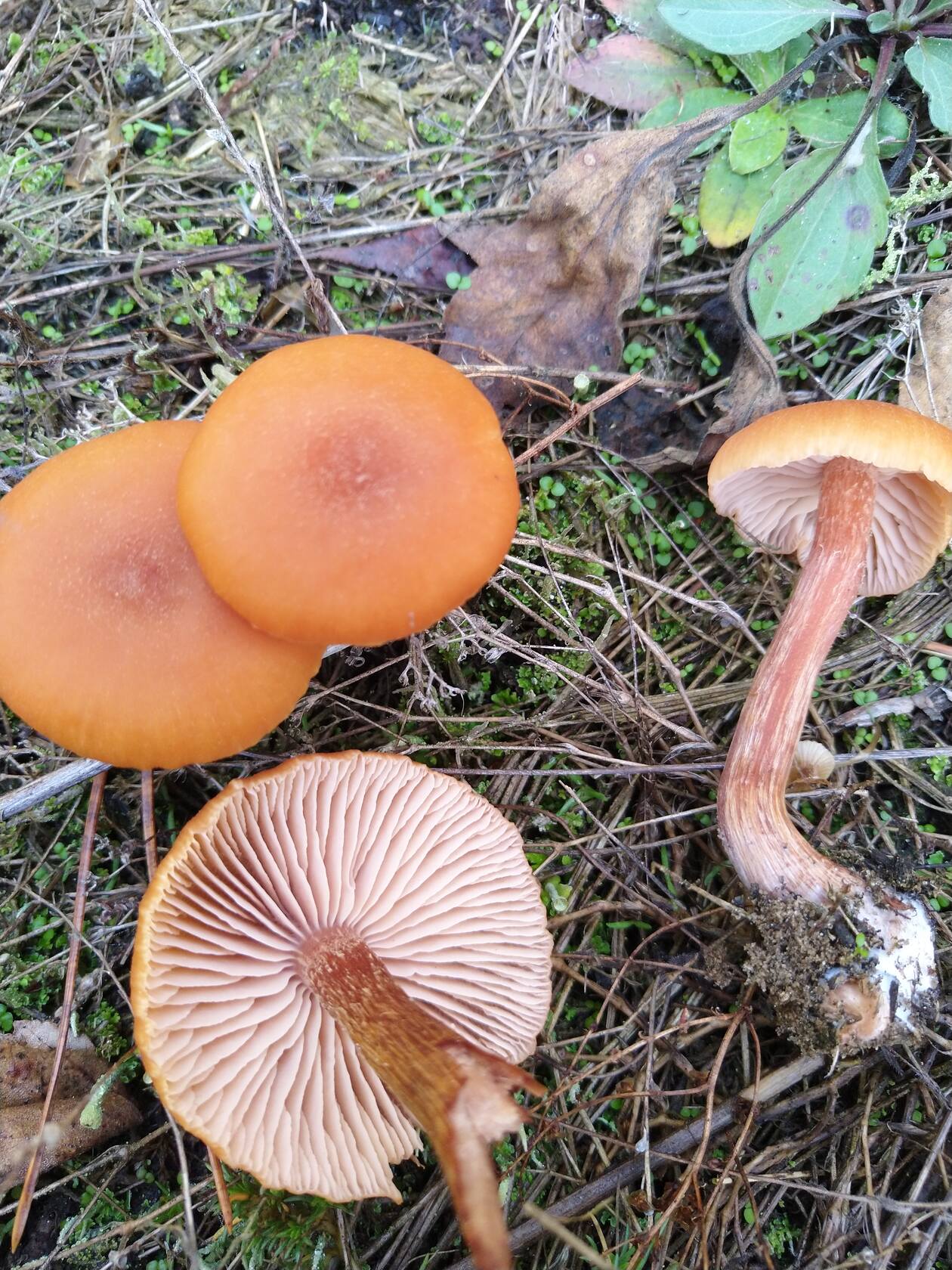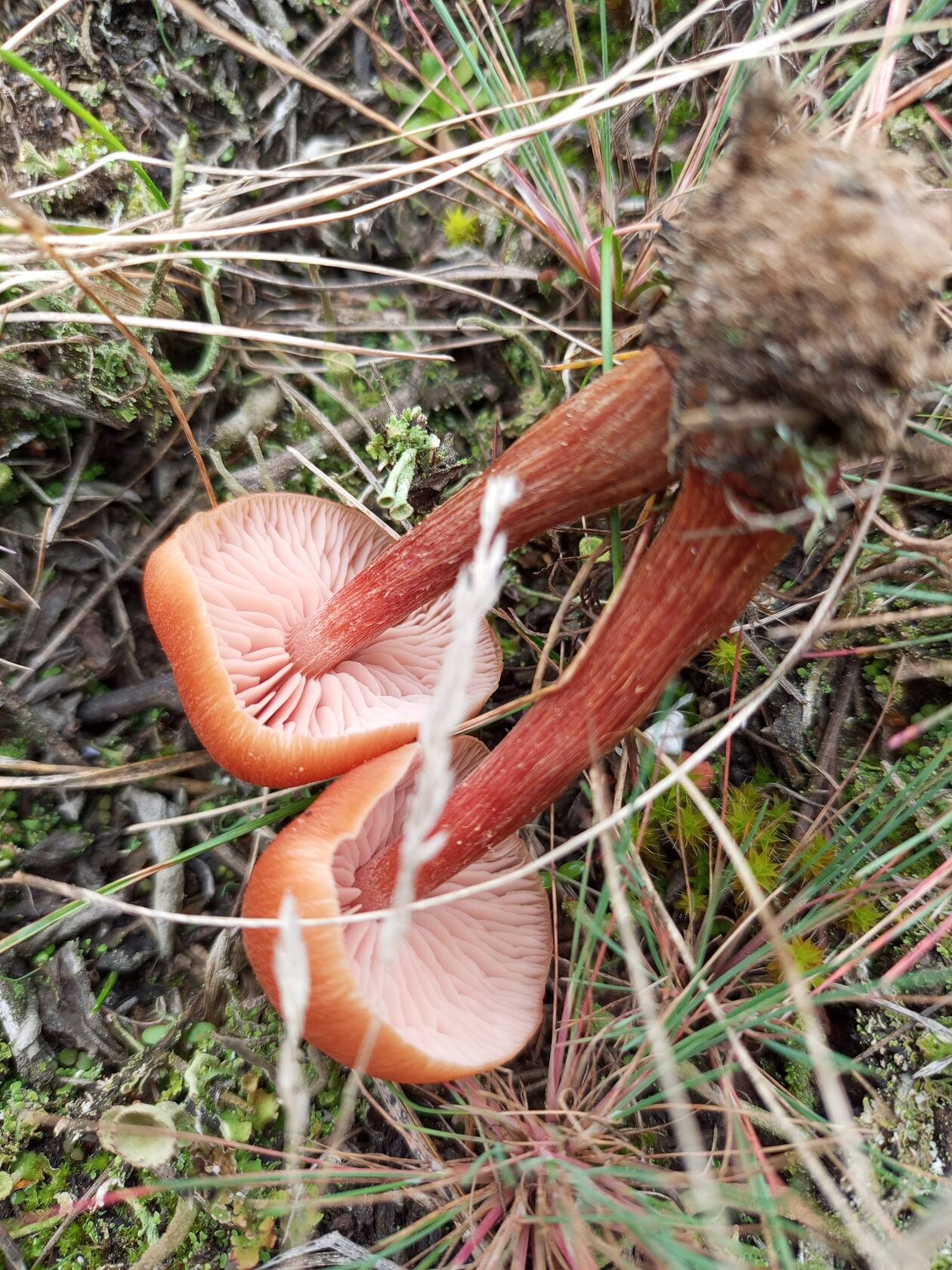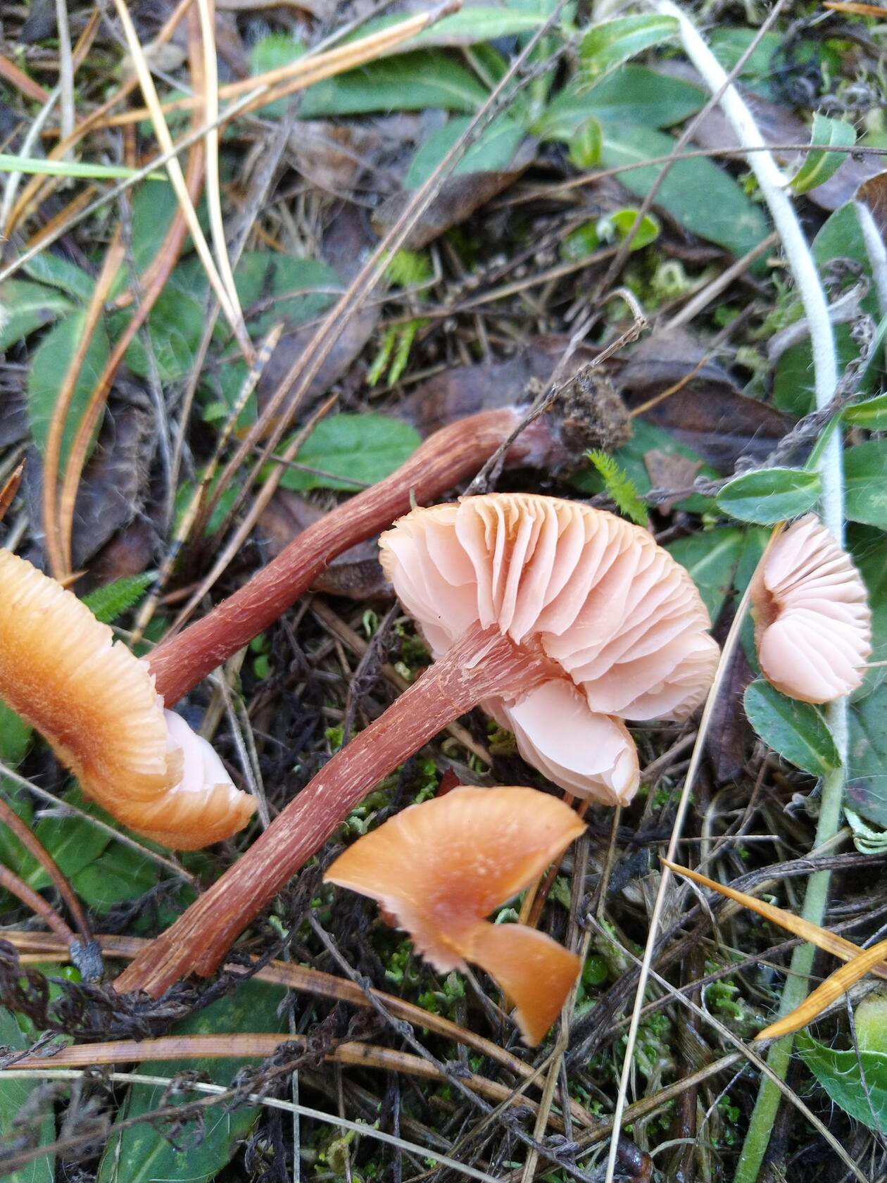 И ещё. Поиск привёл ближе всего к тому, что это Ла́ковица ла́ковая, или ро́зовая (Laccaria laccata), но розового цвета там мало, разве только под шляпкой. Сомнительно, а что же тогда это?