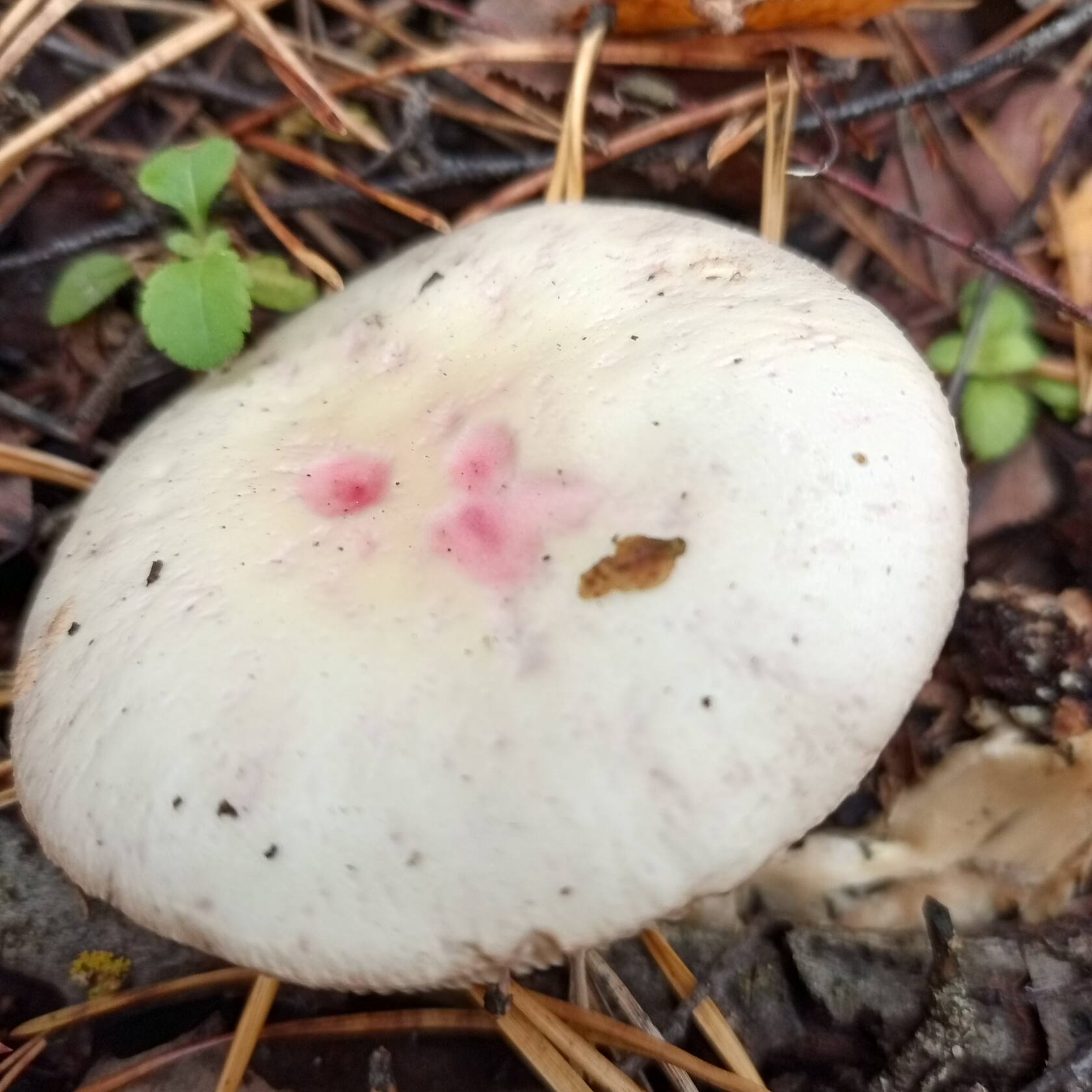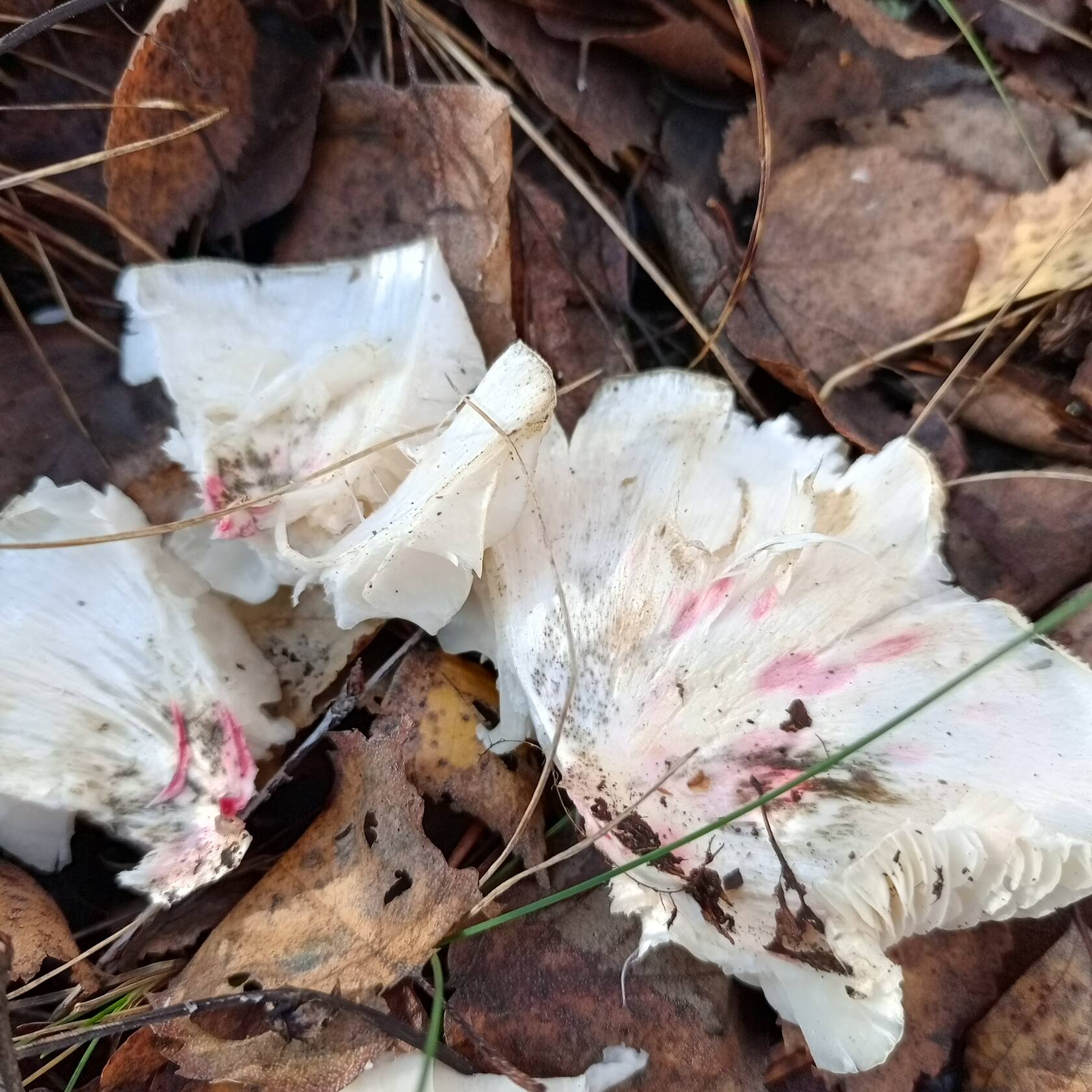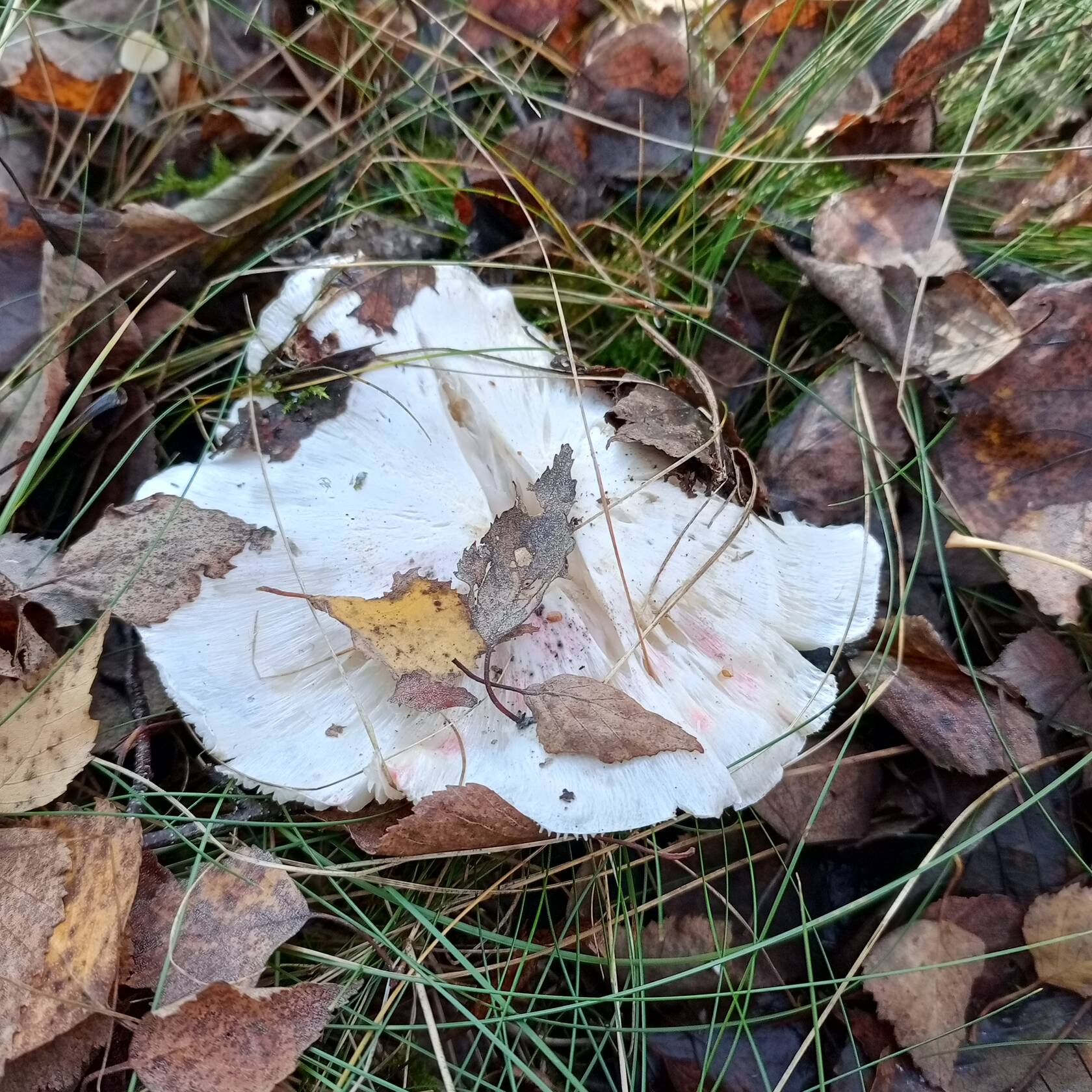 Добрый день, уважаемые грибники! Похож на рядовку штриховатую, но белый. Боязно стало брать в лукошко. Что за "зверь" такой? Смешанный лес с преобладанием берёзы и сосны. Места где растут штриховатые и зеленушки. Заметил розовые пятна на шляпке.