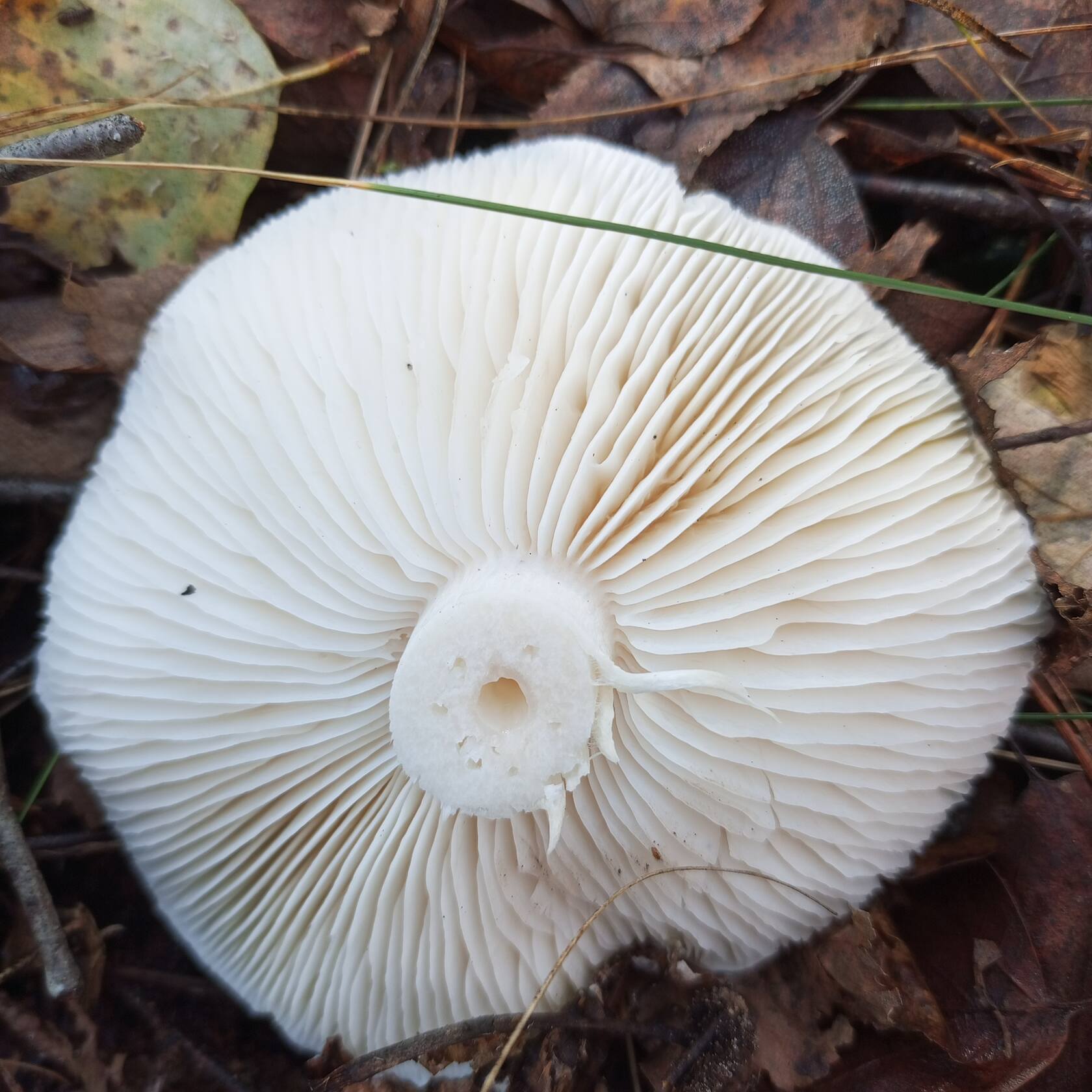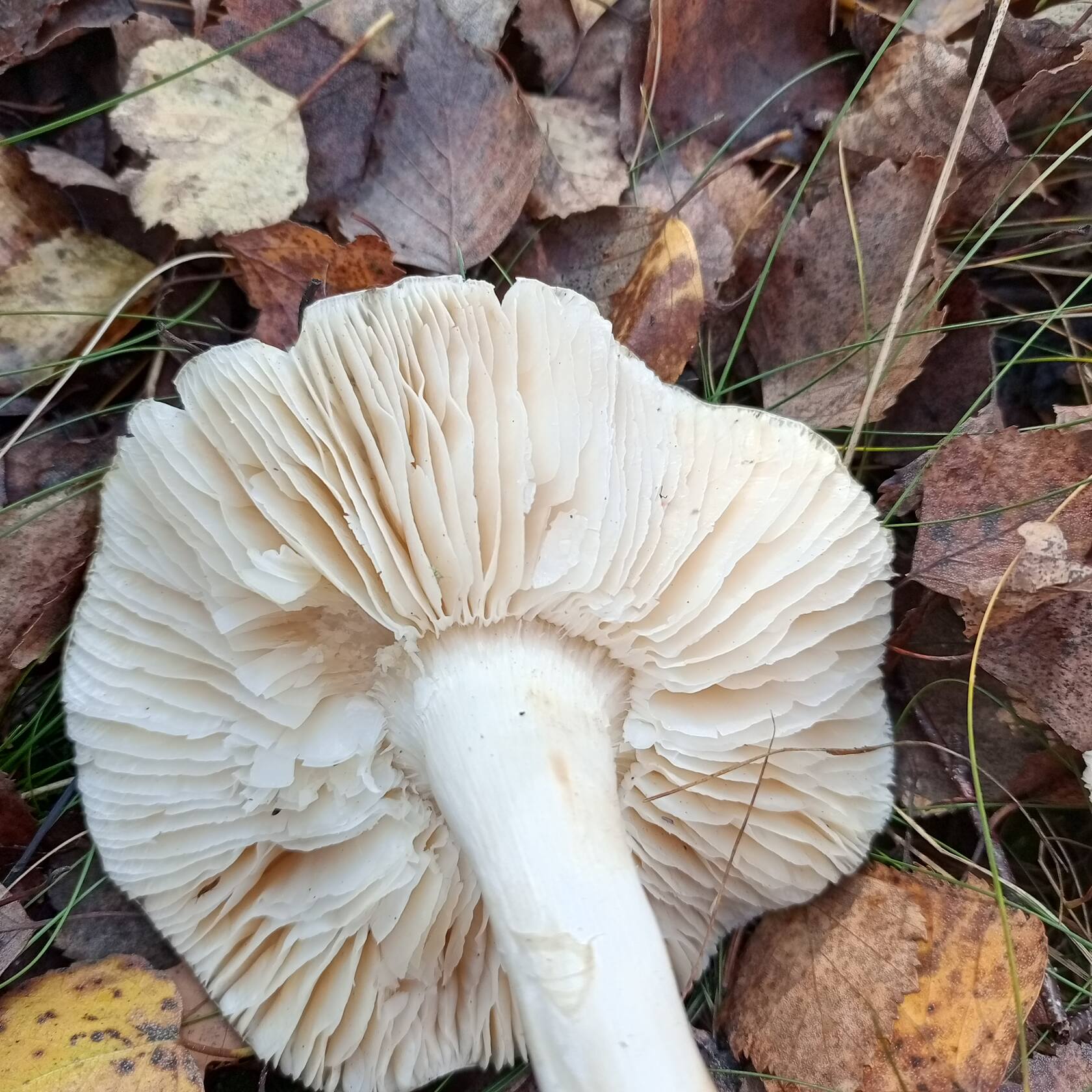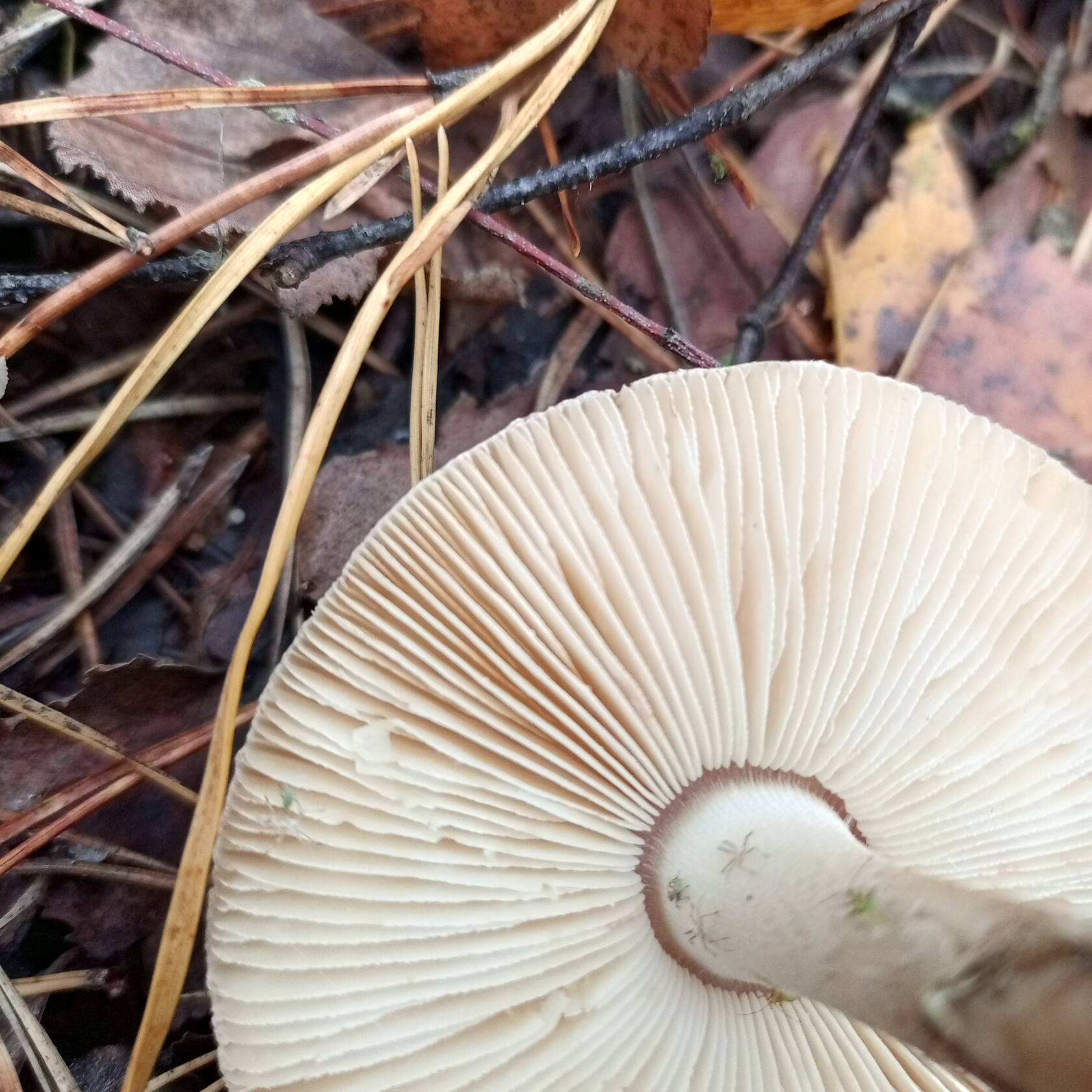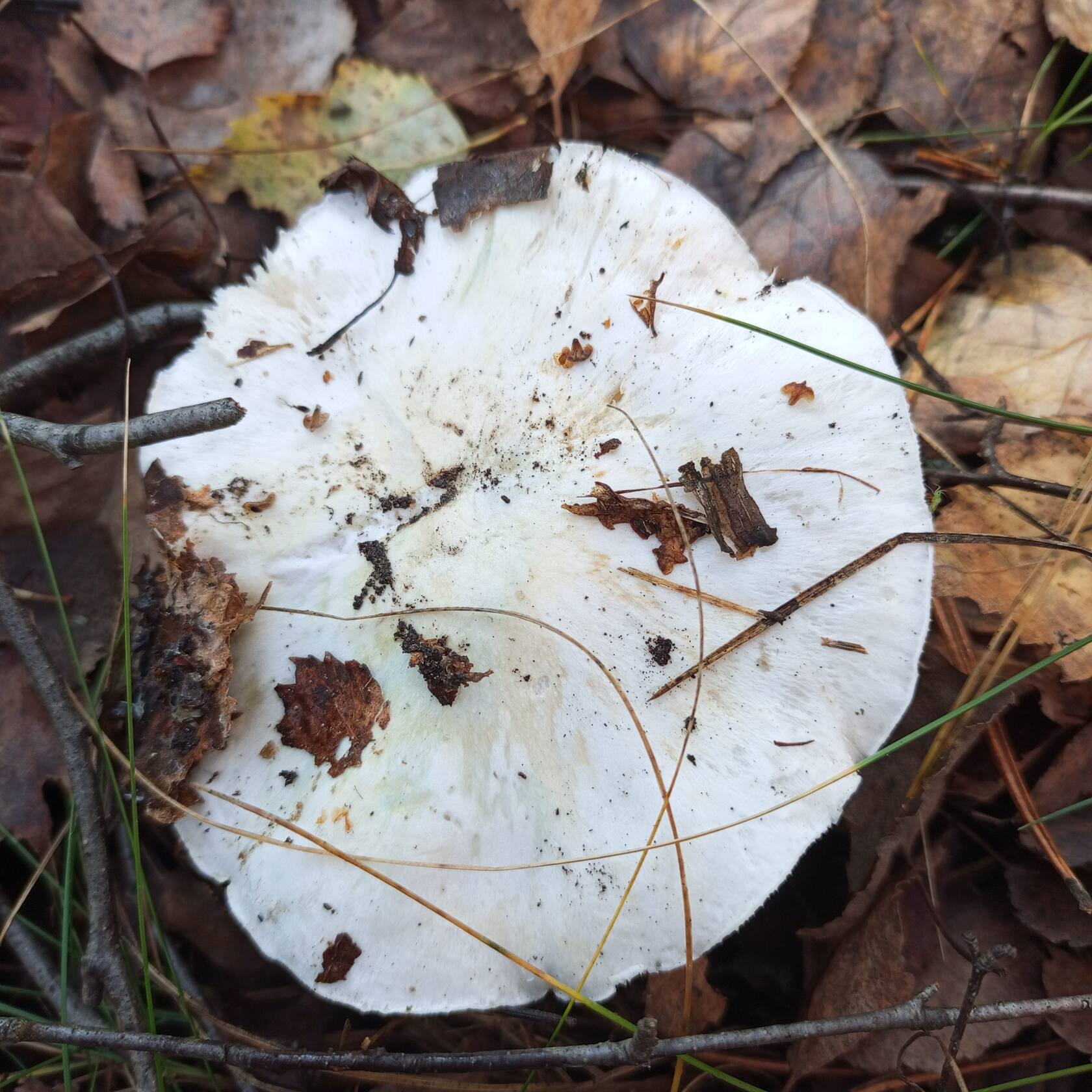 Добрый день, уважаемые грибники! Похож на рядовку штриховатую, но белый. Боязно стало брать в лукошко. Что за "зверь" такой? Смешанный лес с преобладанием берёзы и сосны. Места где растут штриховатые и зеленушки. Заметил розовые пятна на шляпке.