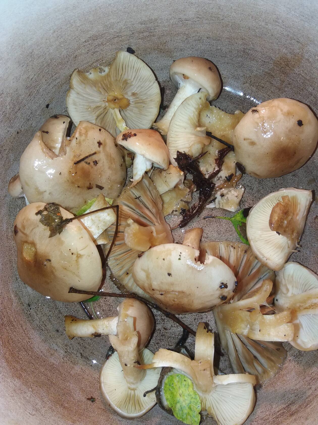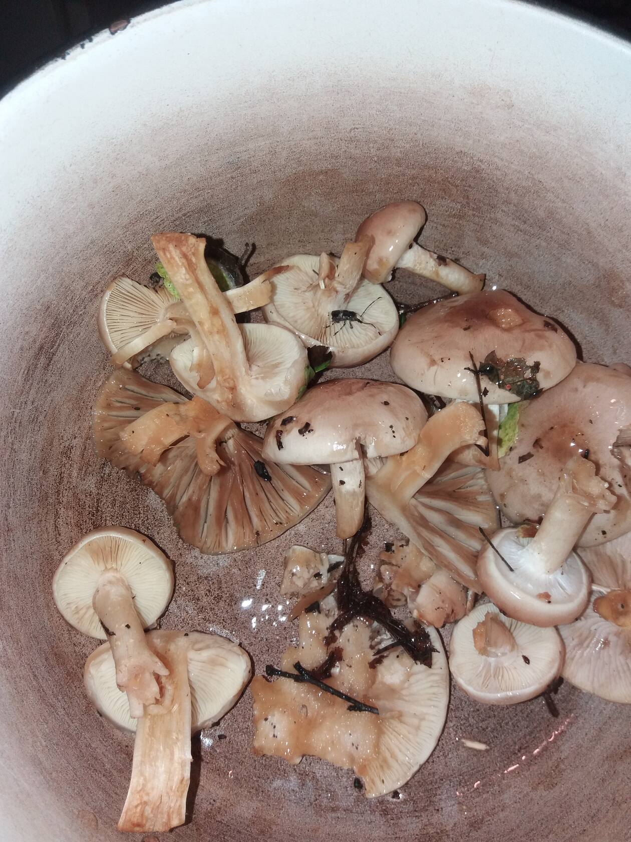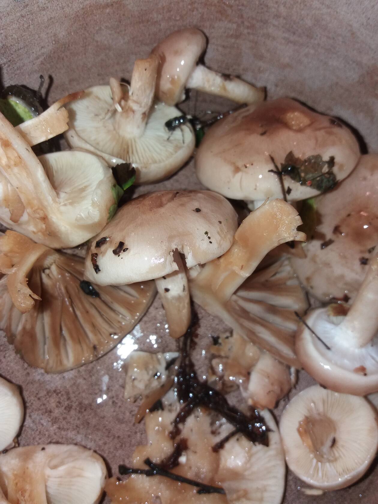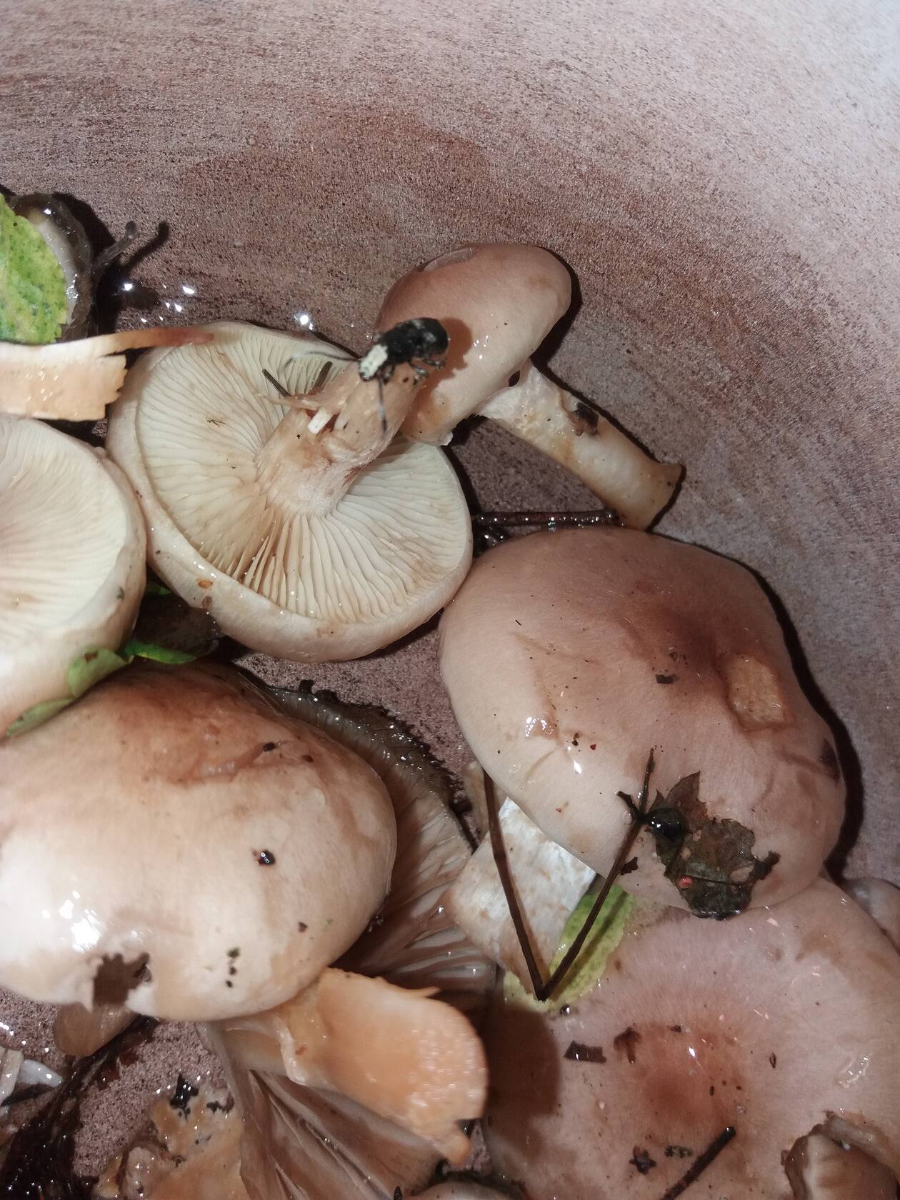 Подскажите, пожалуйста, что могут представлять собой эти грибы. Они обнаружены сегодня в густом смешанном лесу, где росли семьей рядом с рядовками фиолетовыми.