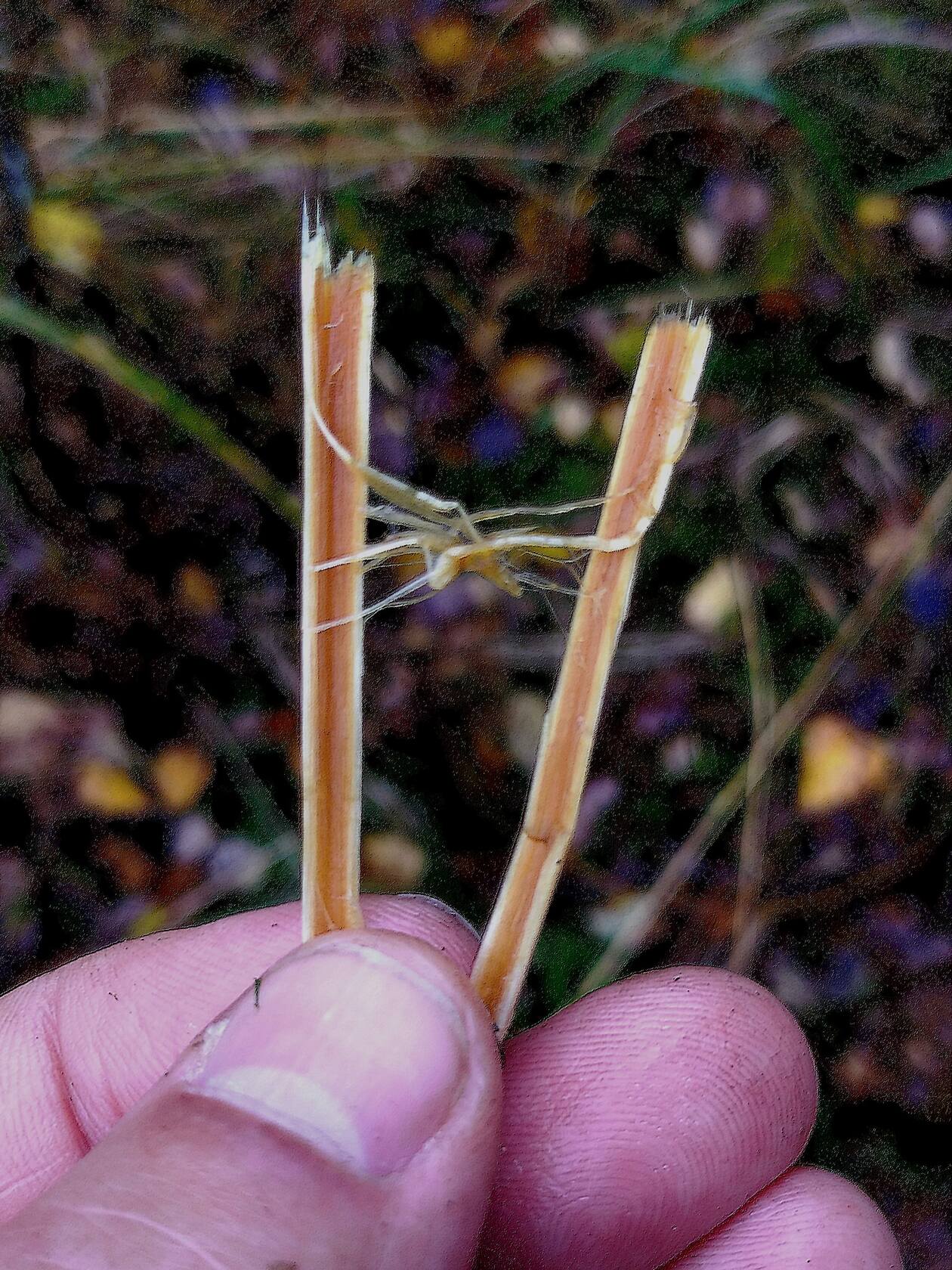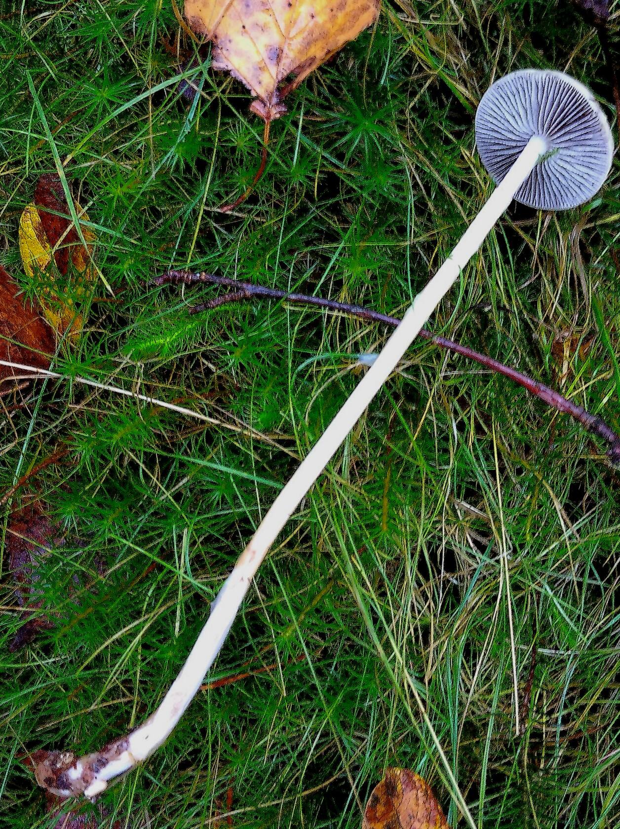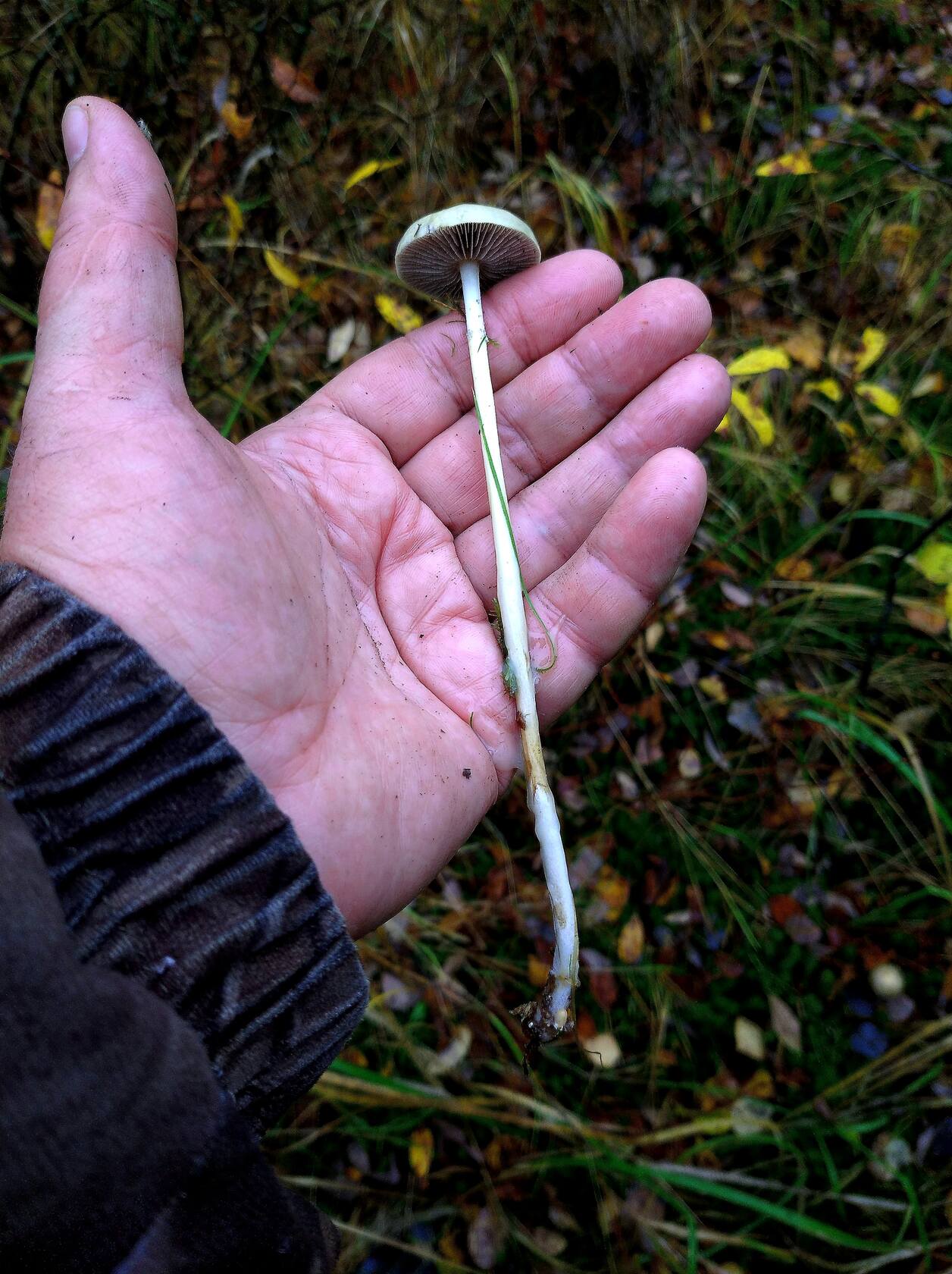 Агроцибе высокая ( Agrocybe elatella )? Край болота, росли 2 плодовых тела... Ножка у молодого гладкая и жёсткая ( как соломинка ), 15- 16см длиной, внутри красноватая, пустотелая. Вкус и запах никакие. У более возрастного ножка - по видимым остаткам кольца - разного цвета, шляпка гигрофанная.
