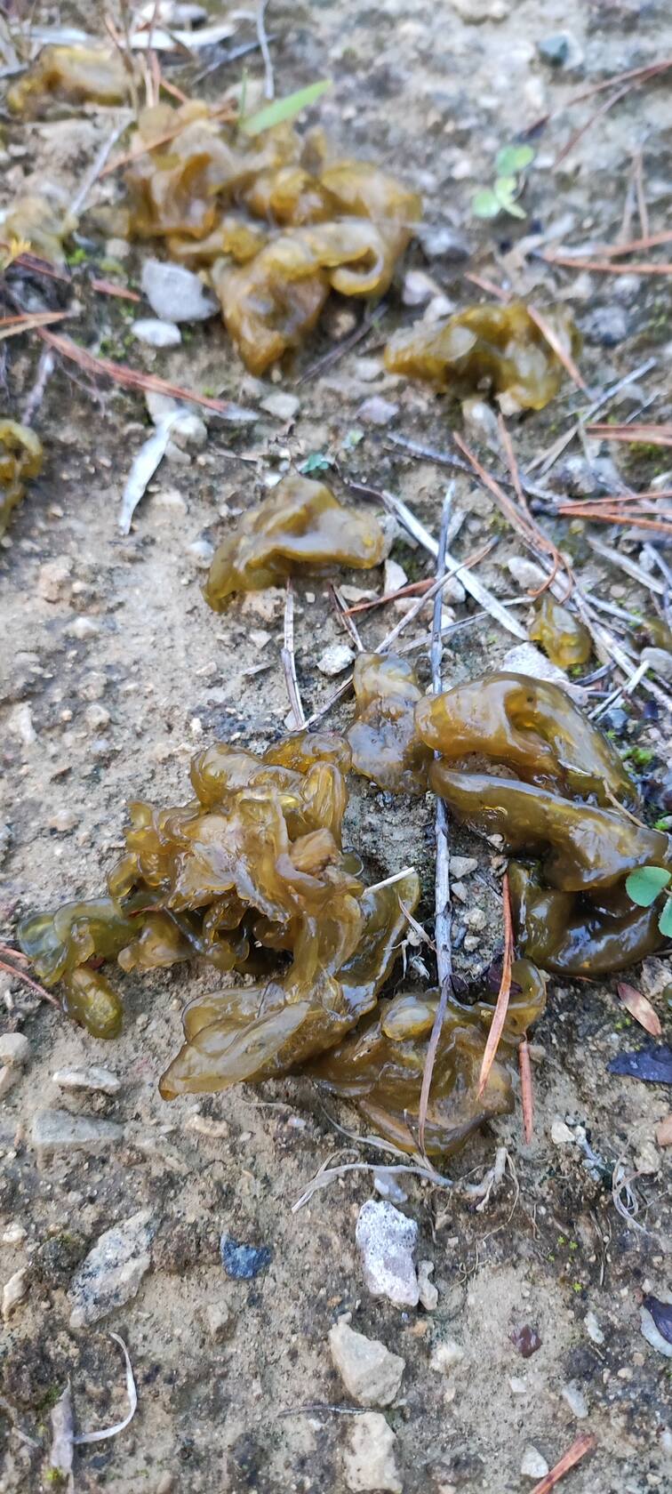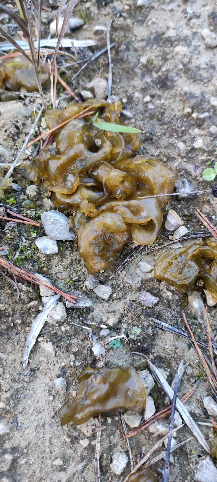 Вчера на юге Московской области наступили в непонятную зелёную субстанцию, которая при более внимательном рассмотрении оказалась грибами. Растут обильно в сосновых посадках вдоль тропинок. Почва песчаная, очень бедная и с изменённой кислотностью (щелочная?), рядом растущие сосны хлорозят и маленького роста. В нормальных соснах этого зелёного нет.