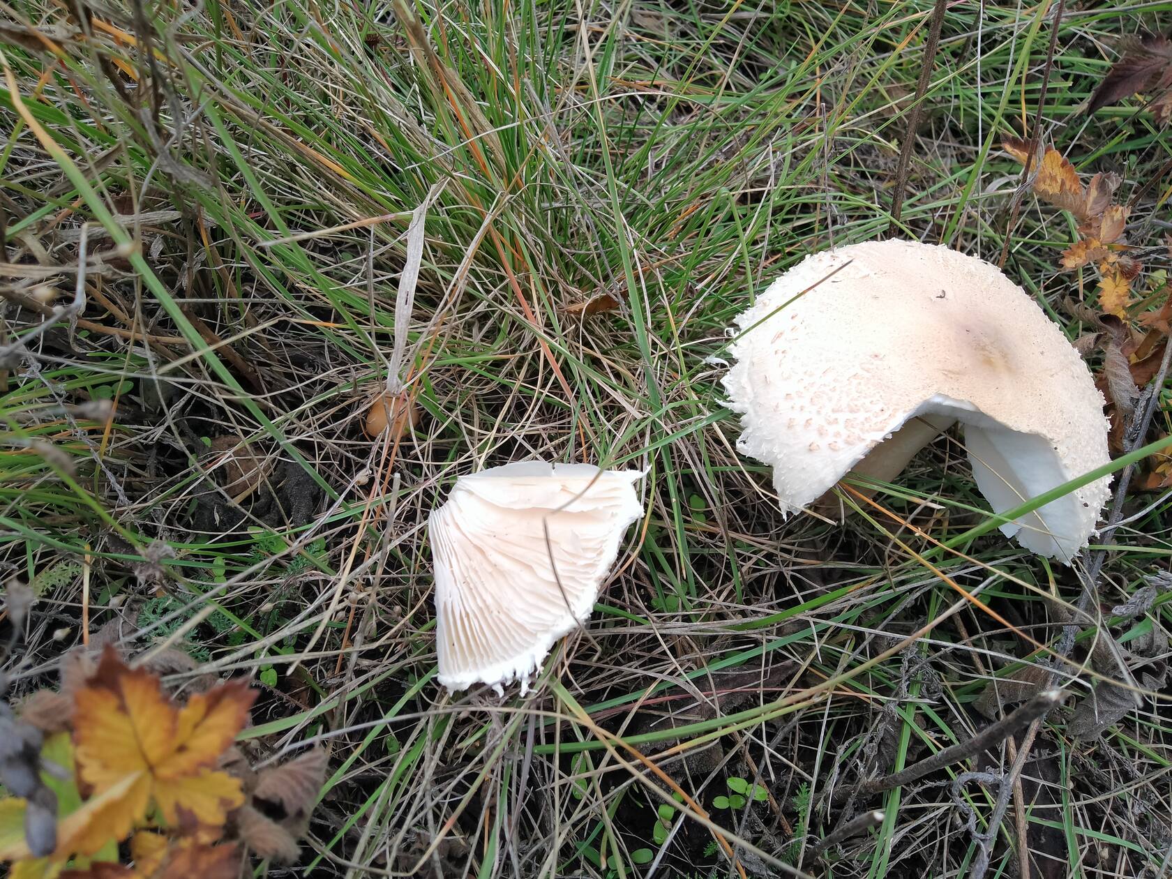 Походил недалеко от дома. В лесочке только разная грибная мелочь, а на лугу нашлись несколько шампиньонов, зонтик белый и корончатая строфария ну и мелочь конечно. А вот эти грибы под вопросом, то ли белошампиньоны, то ли какая-то несъедобная лепиота