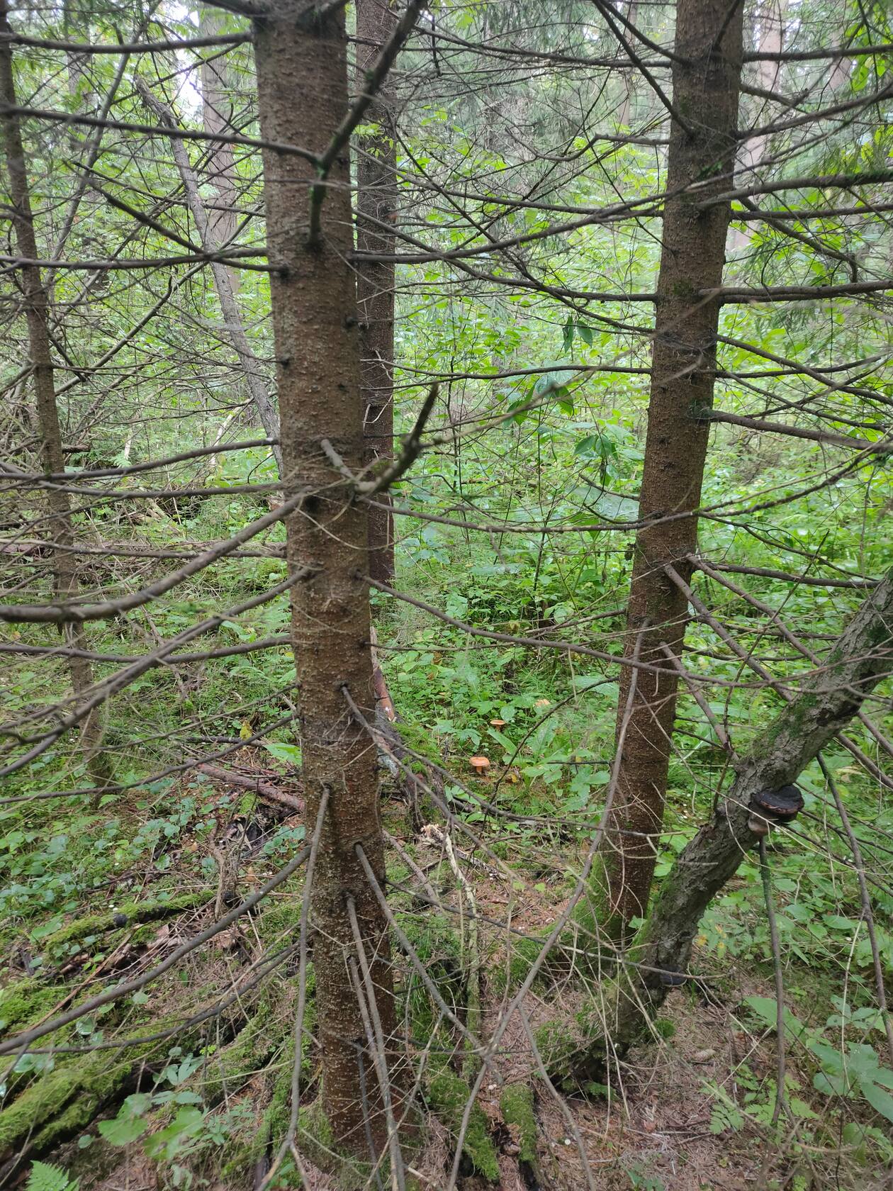 У меня или классический смешанный лес с большими ёлками или есть ещё бестравный ельник, выглядящий, как старая посадка, но там вообще почти ни чего нет никогда. Есть старый сосновый лес, но довольно заросший кустарником и трава высокая. Не бор, в общем.