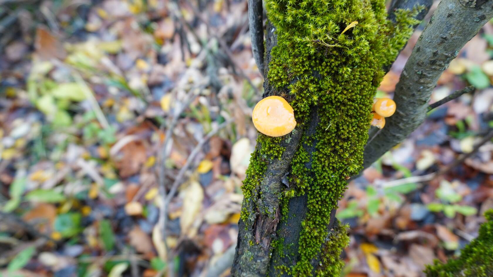 Еще одна флеогена. На фоне гигрофоров проглядывает грибок похожий на циборию, и на других снимках мелькали их тени.
