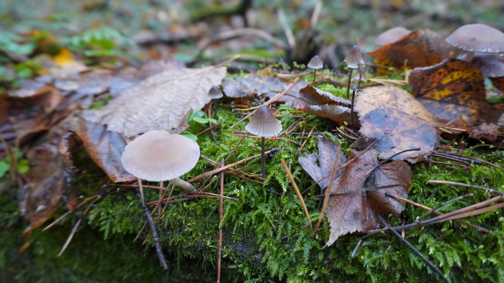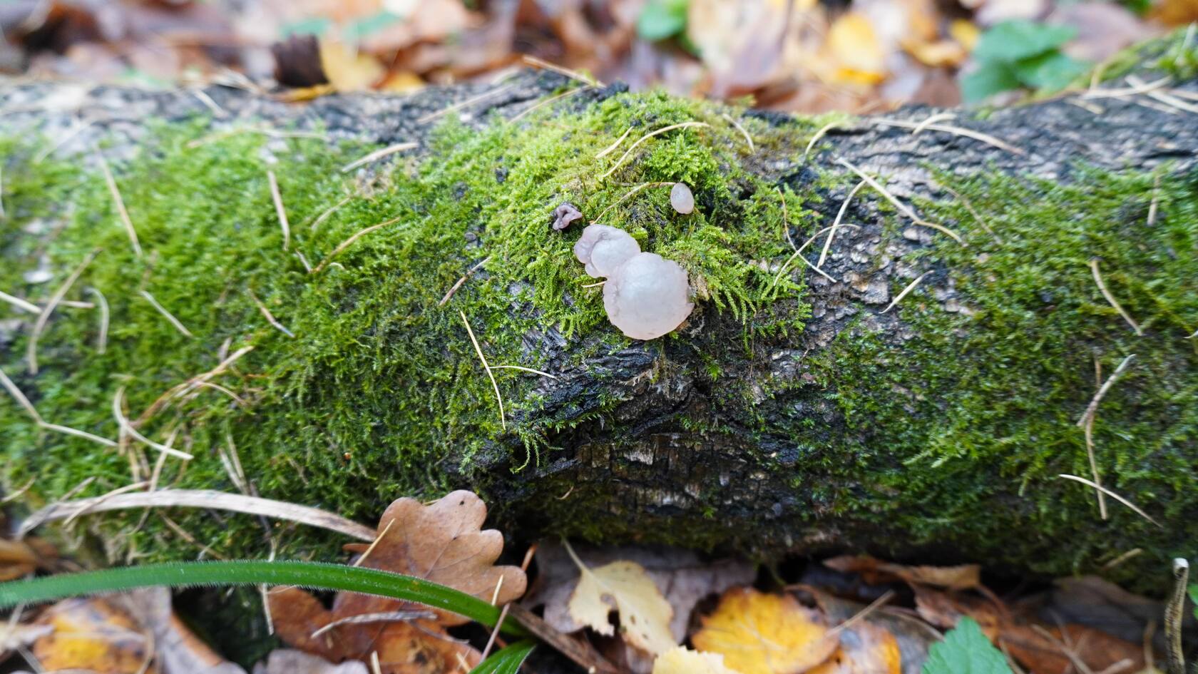 Дрожалки мелькают. Оранжевая- вкусная наверное, клоп и комар(?) лакомятся. На бревне соседствуют псатиреллы и мицены.