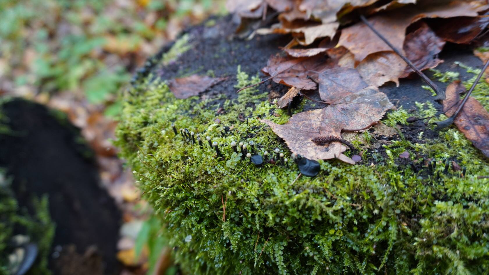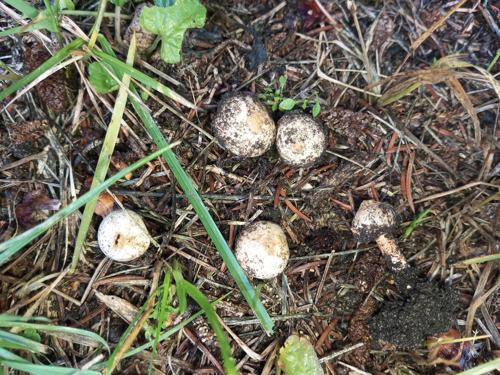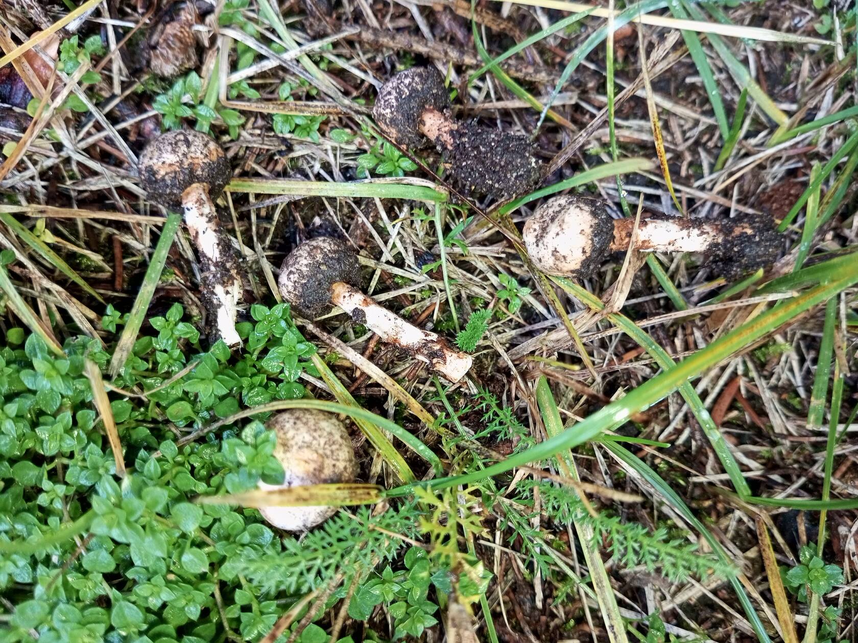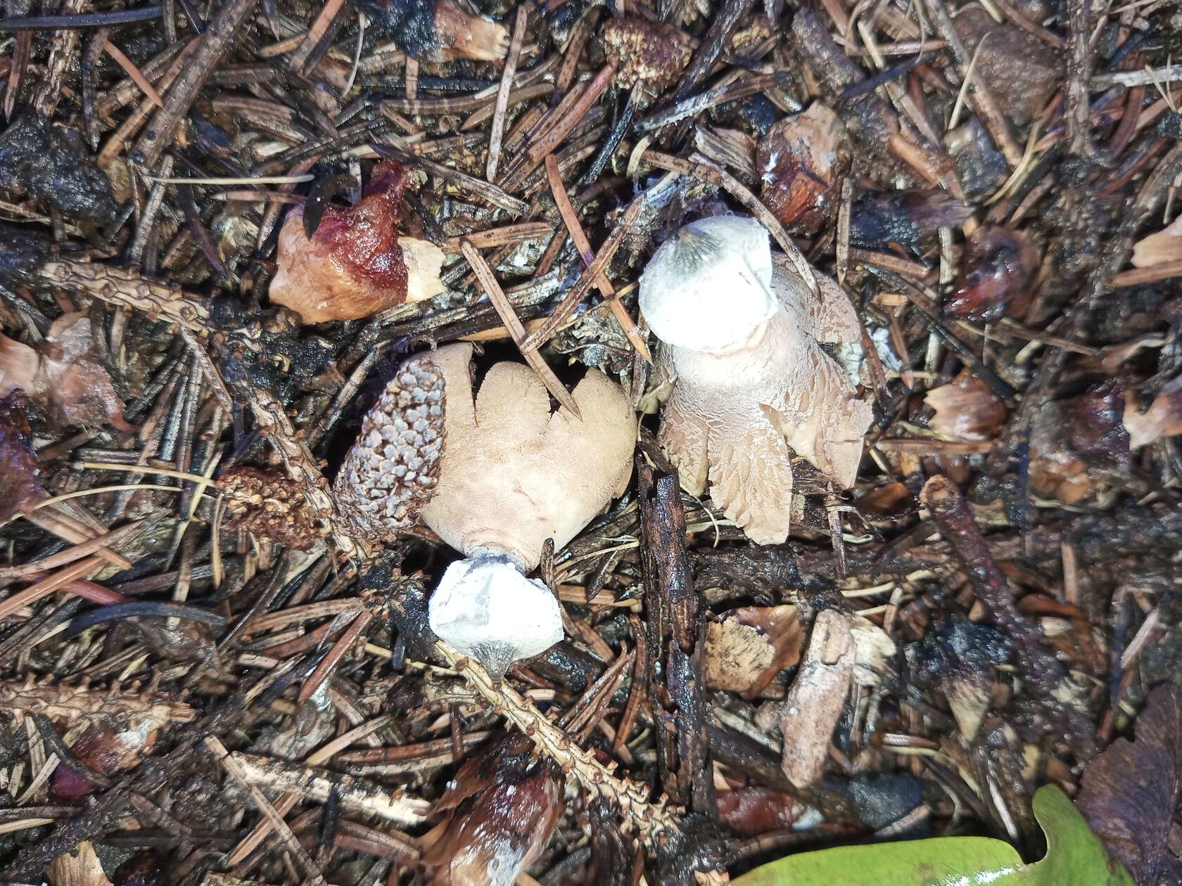 В еловой хвое нашлись звёздовики и что-то. С ножкой, но гименофор(?) выглядит как почва. Кажется, такого раньше не встречал.