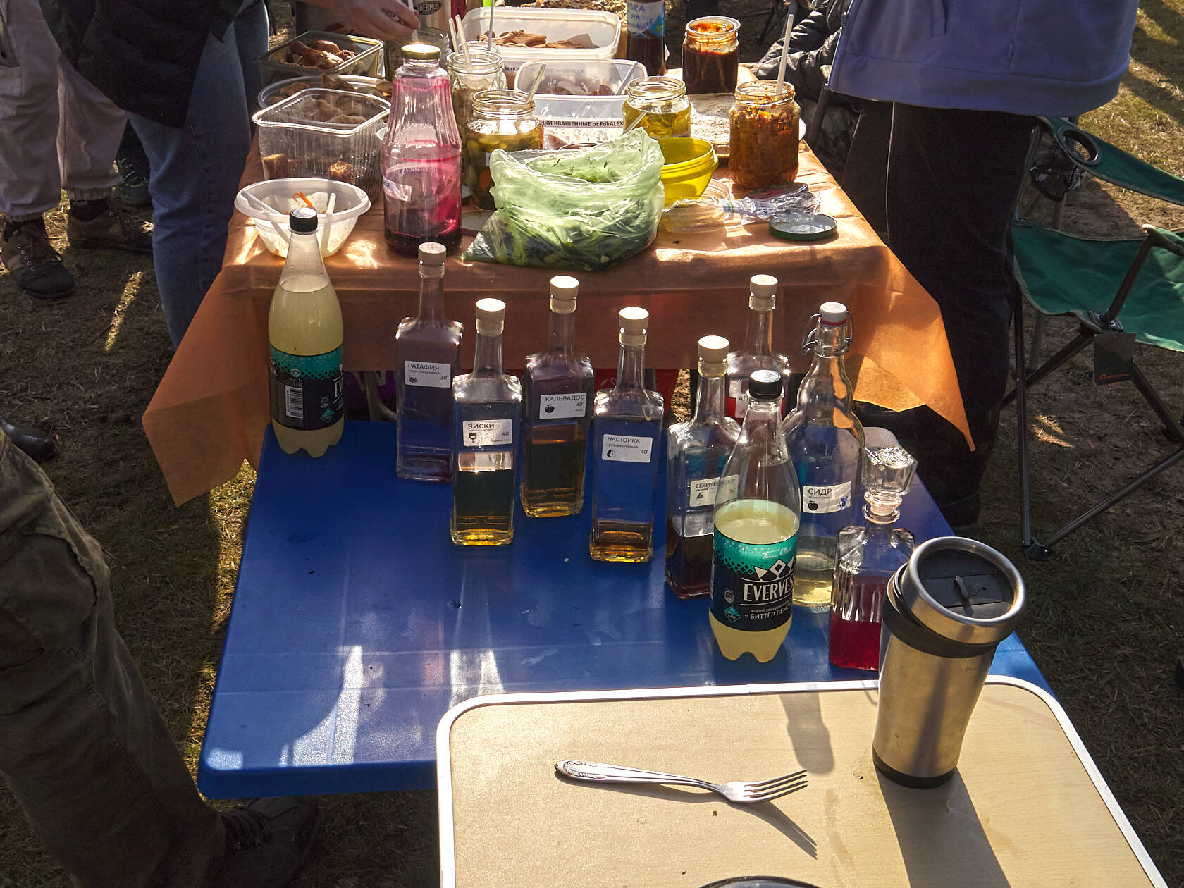А я вчера так и не добралась до знаменитых огурцов))), да и до многих деликатесов тоже. Ну потому что столько всего вкусного, кусочек одного пирога, кусочек другого, пара ложек супчика с черемшой, пара ложек грибного, а тут и рязанские щи подоспели! А ещё же шашлыки и всякие грибные закуски. Ну, в общем, на следующий слёт надо брать какую-нибудь лежанку, а то коврик Марины пользовался большим успехом! Зато Оля угостила меня восхитительным напитком из копчёной груши, перелила его в графинчик, недавно привезённый из Мурома, стоит в буфете, любуюсь))).
