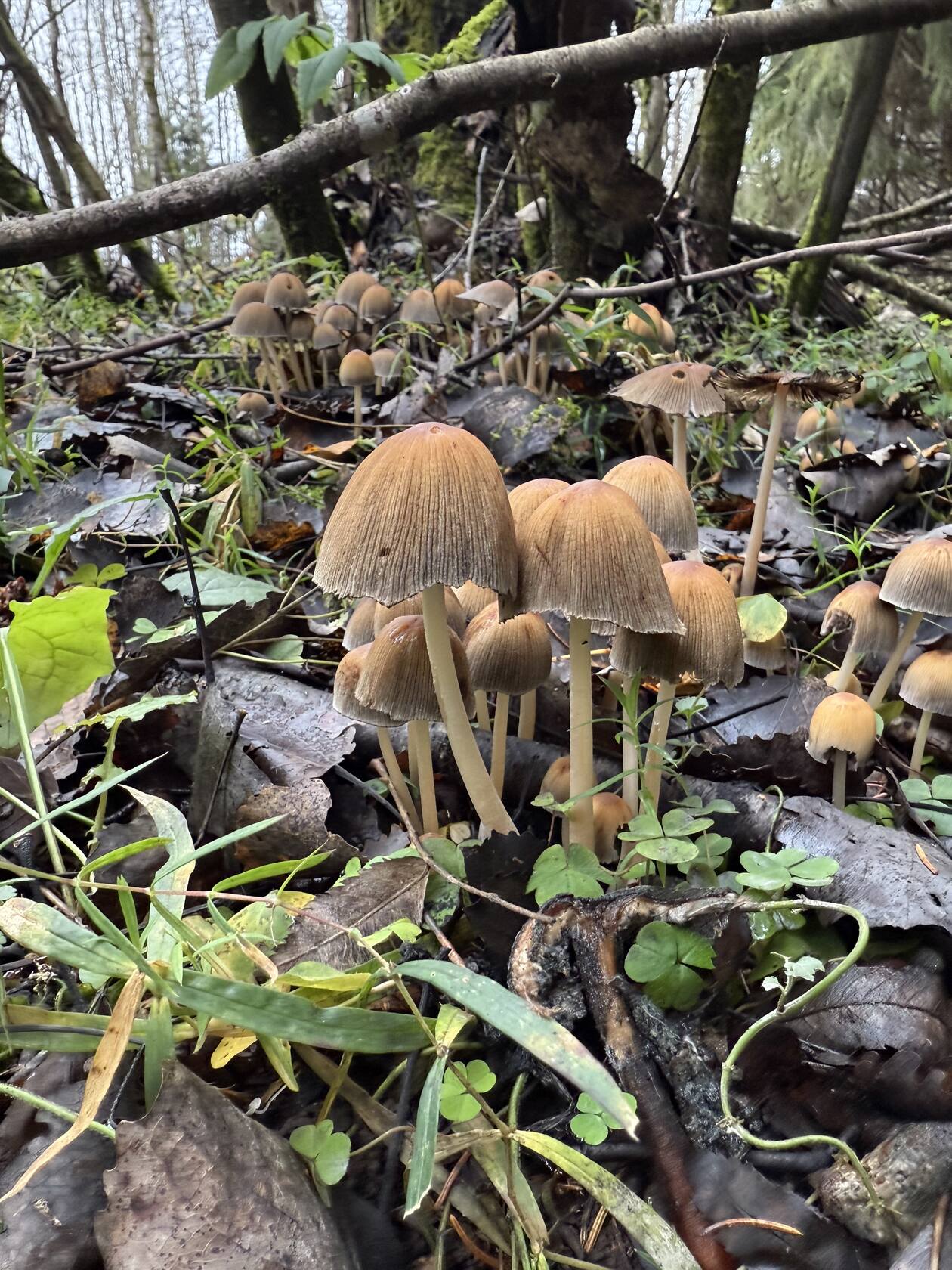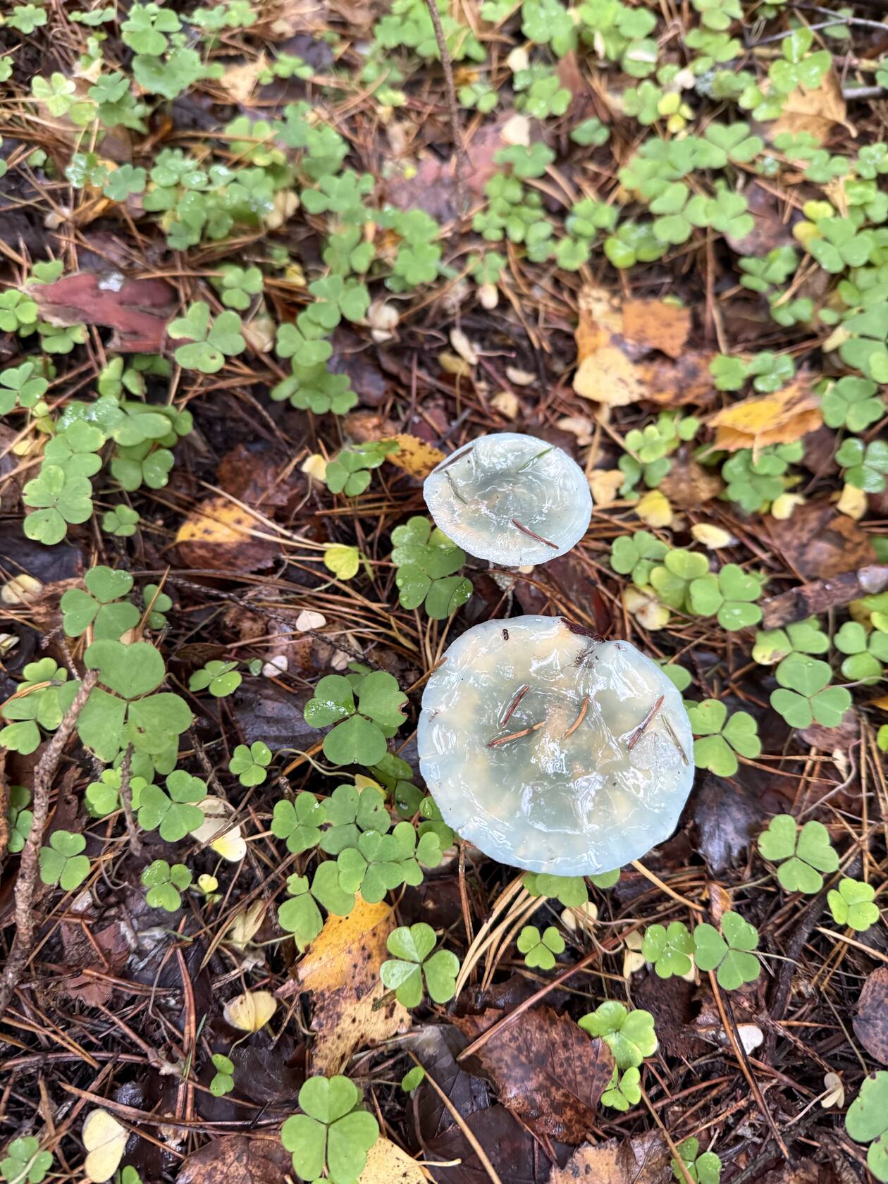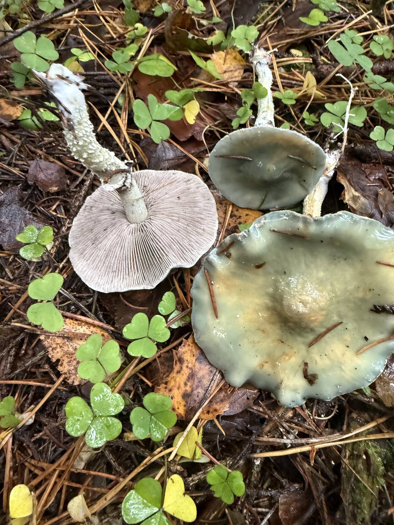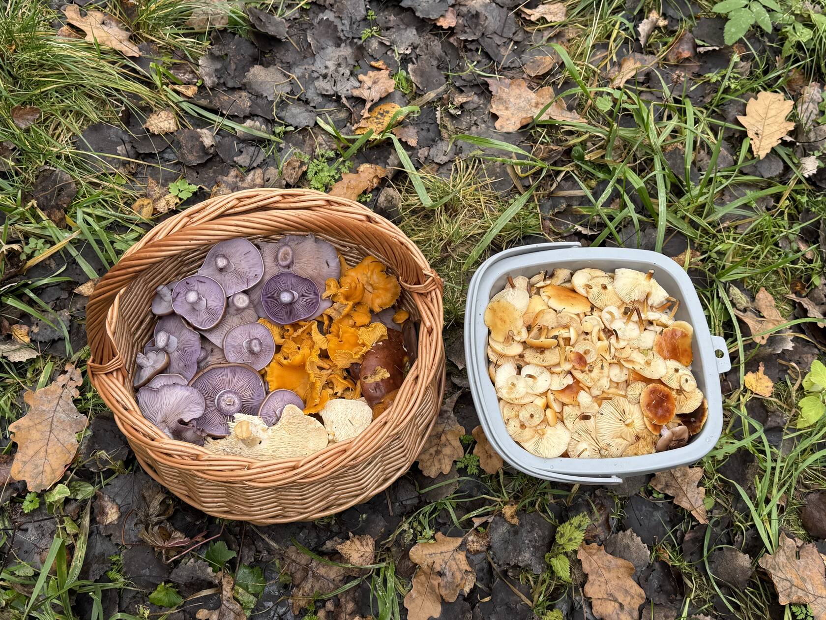 Рядовка отходит. Опят тоже мало. Набрали микс: польские белые, один масленок, лисички, ежовики, гигрофоры (грибы сластена), рядовка фиолетовая. Ещё встречаются ежовик коралловидные и мухоморы, также нашла что-то зеленое. На этом всё.
