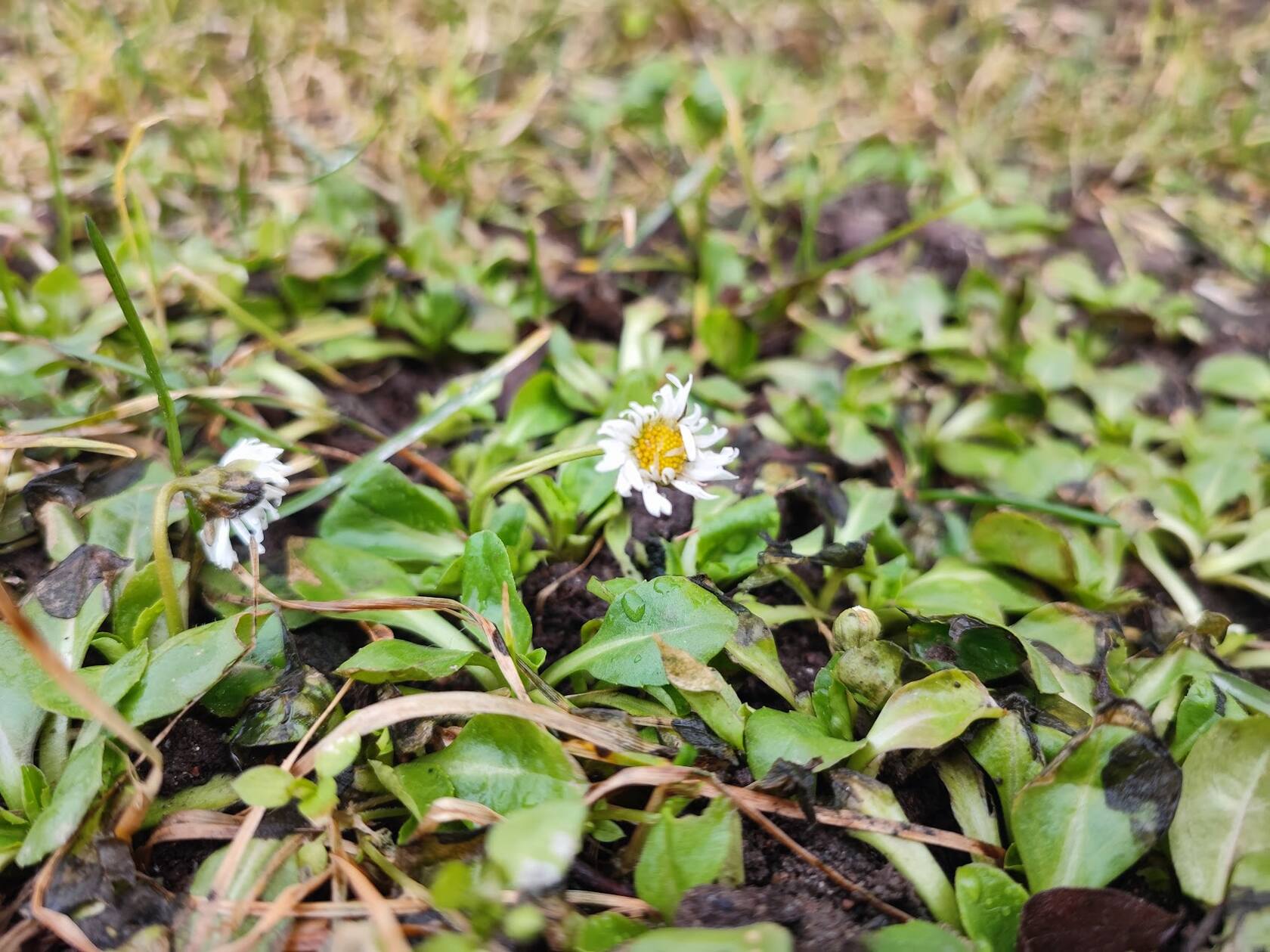 Маргаритки в газоне, такое ощущение, что вообще и не переставали цвести под снегом:
